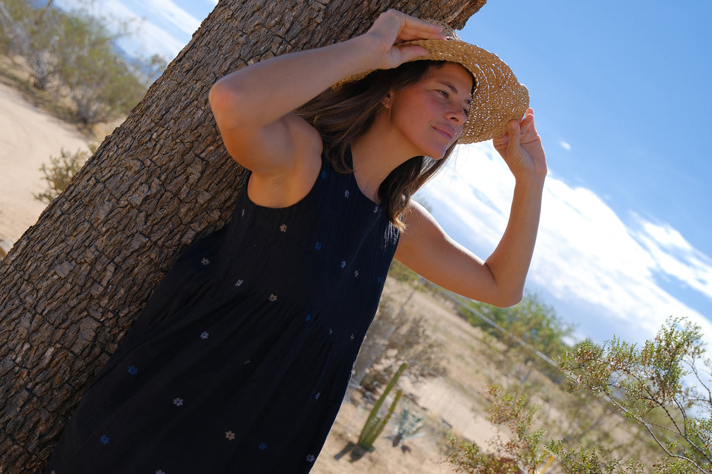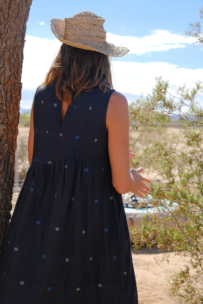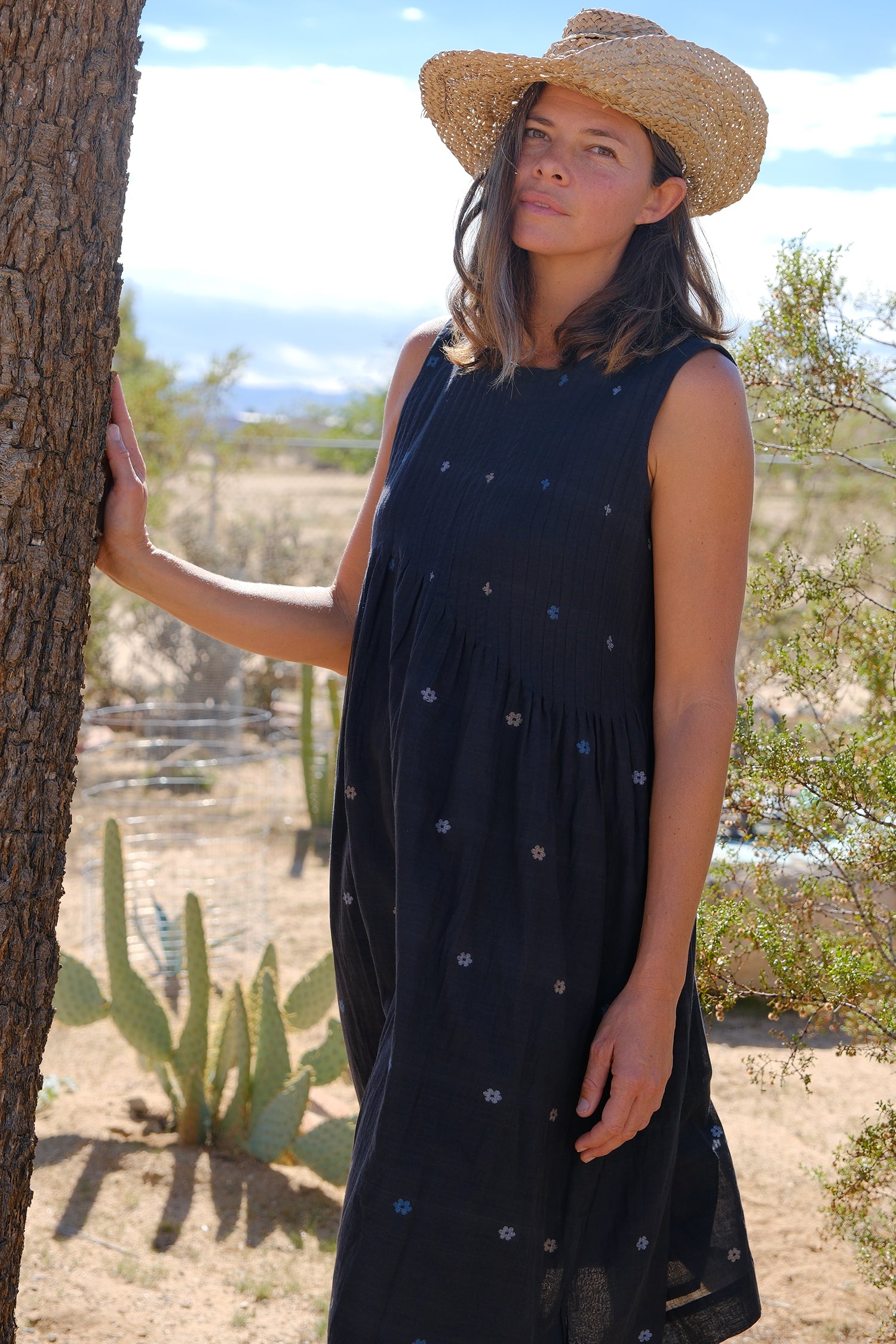 Crafted from soft, breathable black Jamdani fabric, this sleeveless dress is a perfect blend of elegance and comfort. Adorned with scattered handwoven floral motifs in subtle blue and gold threads, it showcases timeless artisanal charm. The relaxed silhouette is enhanced with delicate front pleats and curved gathers at the waist, offering a flattering fit that feels both effortless and chic—making it a versatile staple for any occasion.