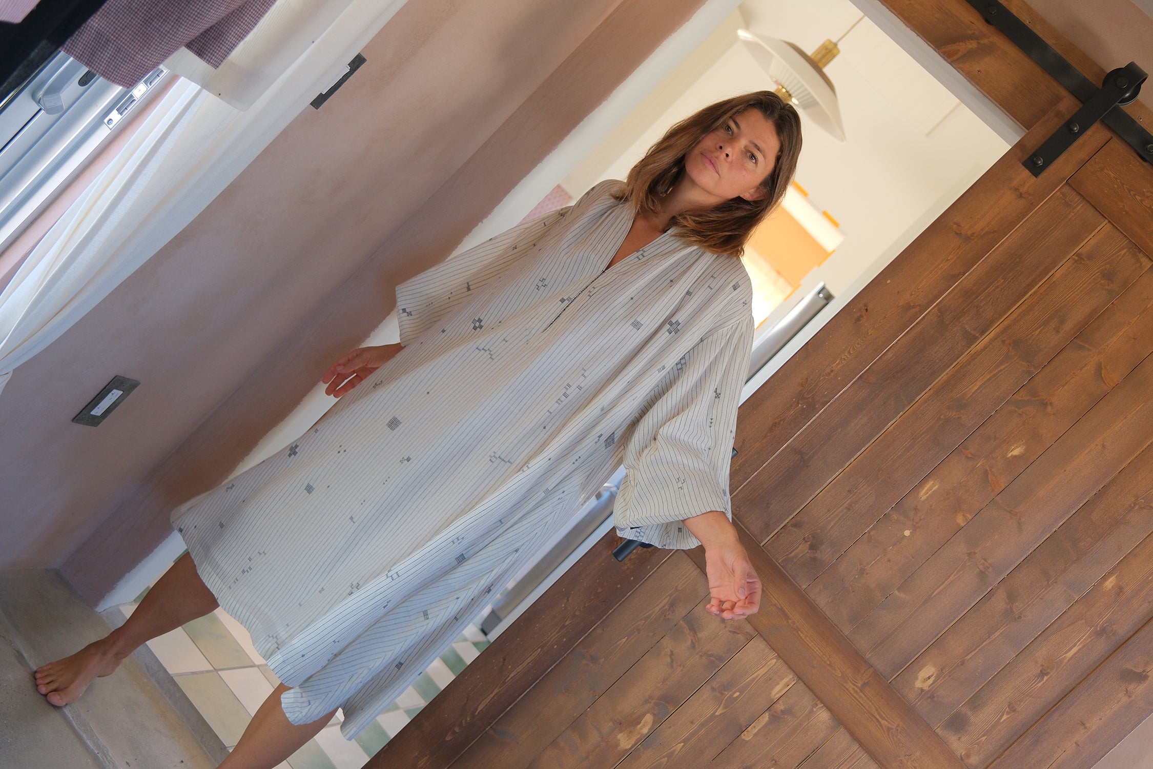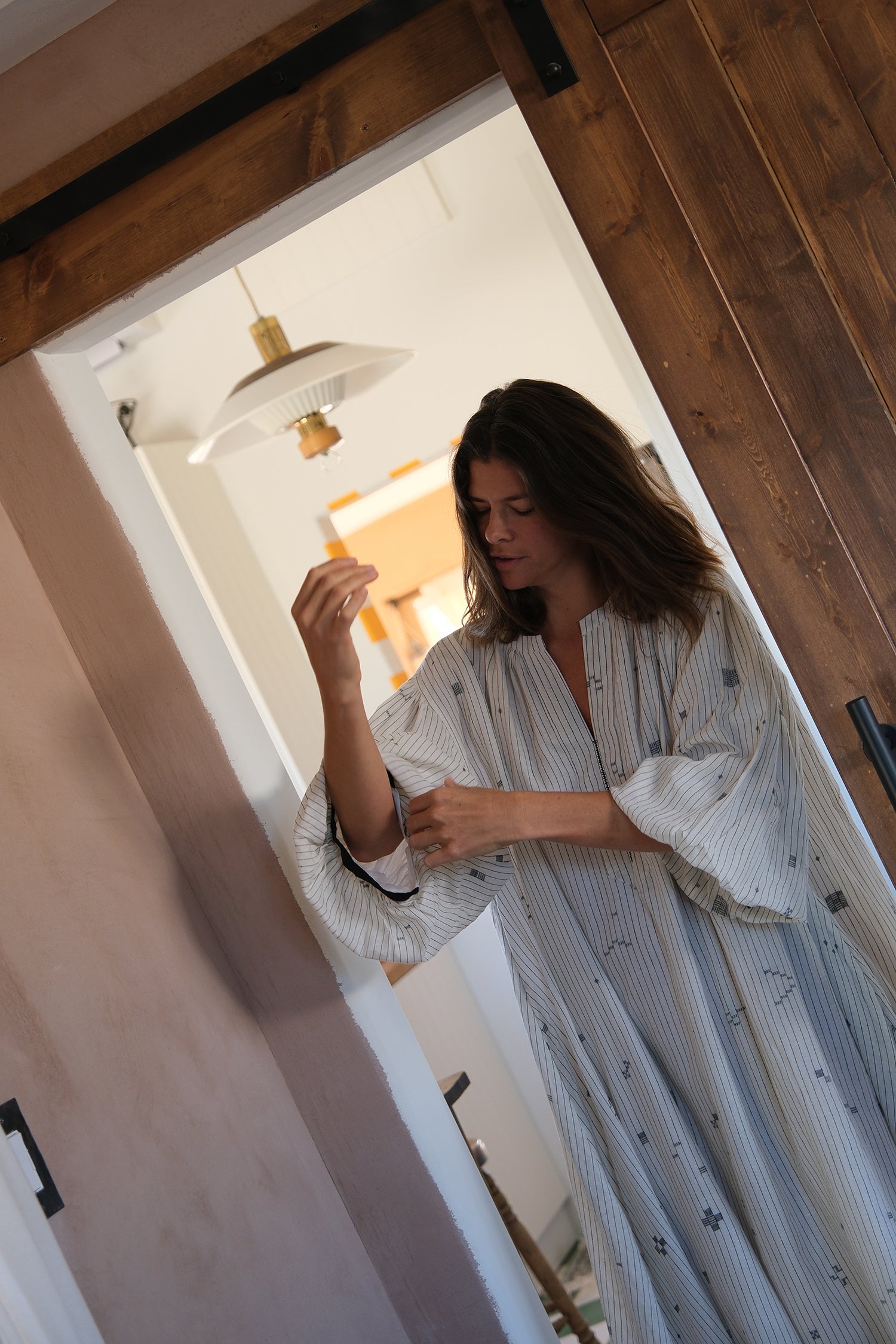 Step into effortless elegance with this handwoven Jamdani kaftan dress in soft, breathable cotton. The off-white base features fine stripes and scattered geometric motifs, highlighting the timeless artistry of Jamdani. With its relaxed silhouette, wide sleeves, and subtle neckline slit, this dress blends comfort and sophistication perfect for both casual days and evening outings.