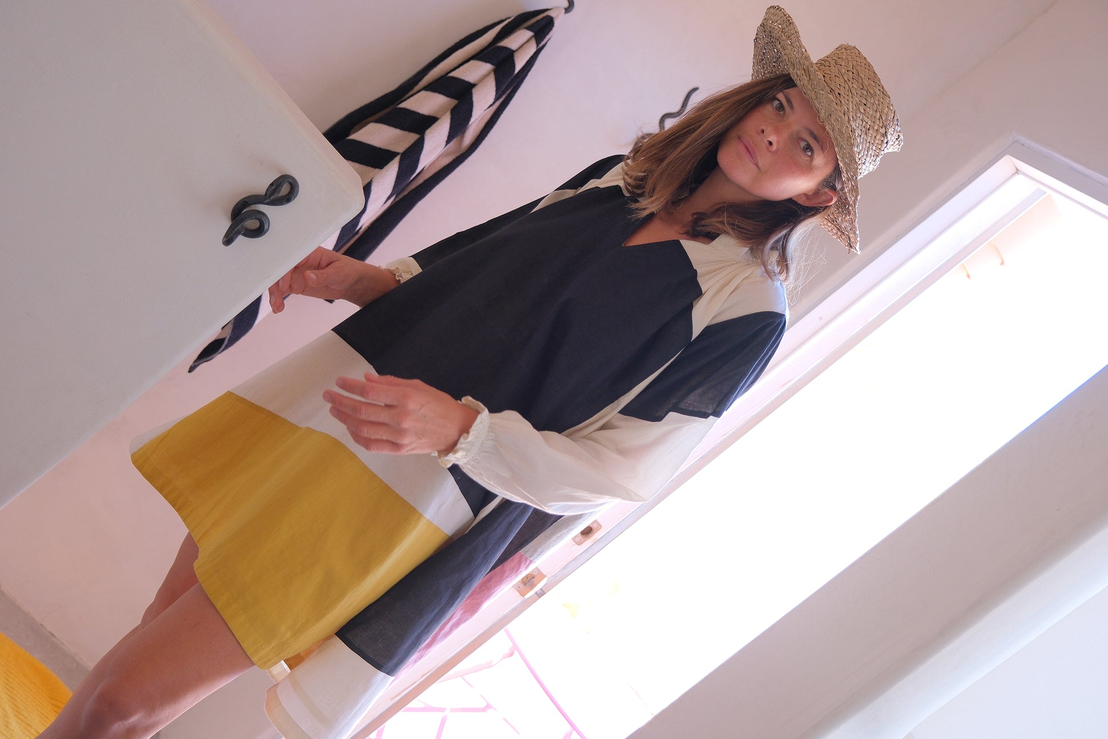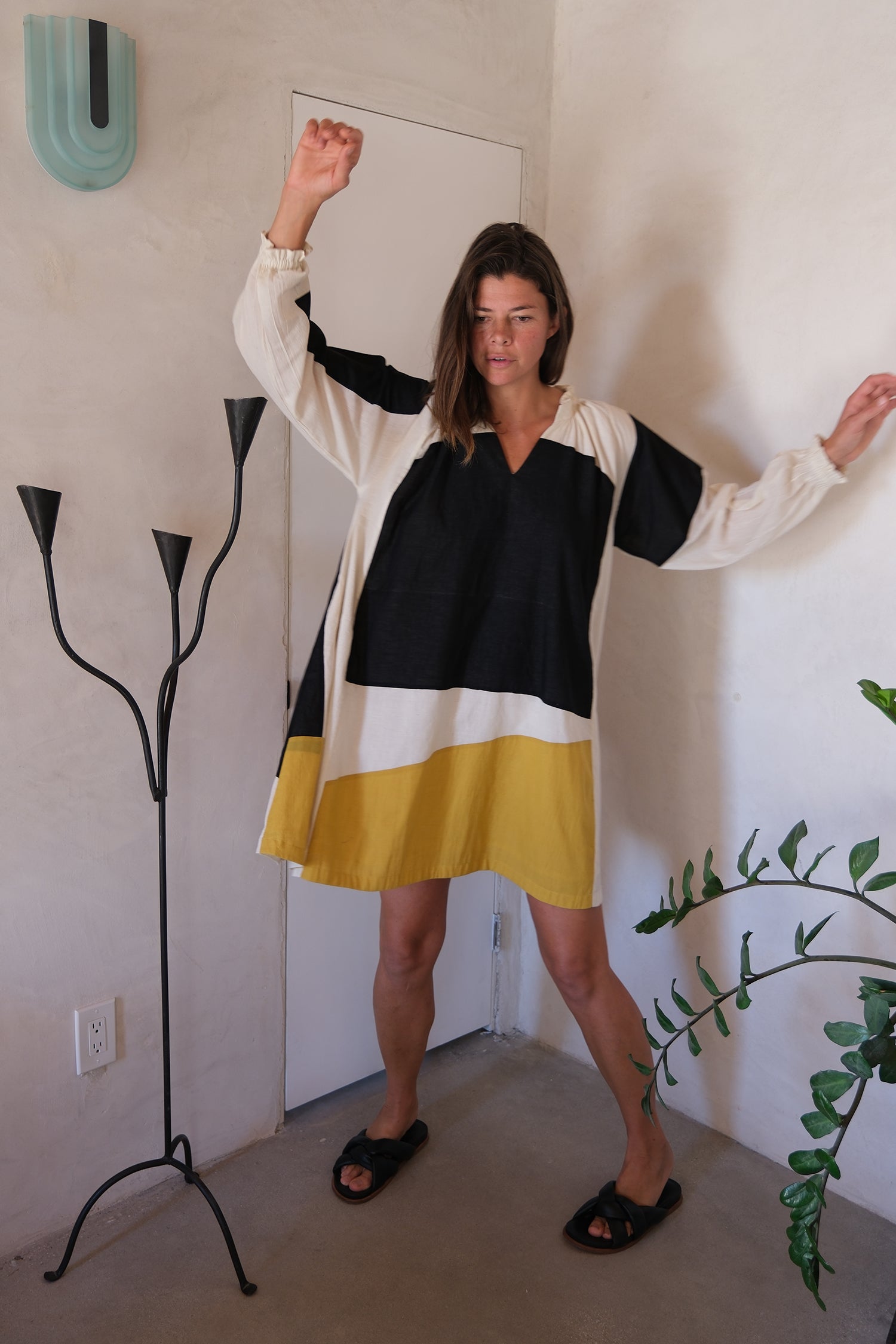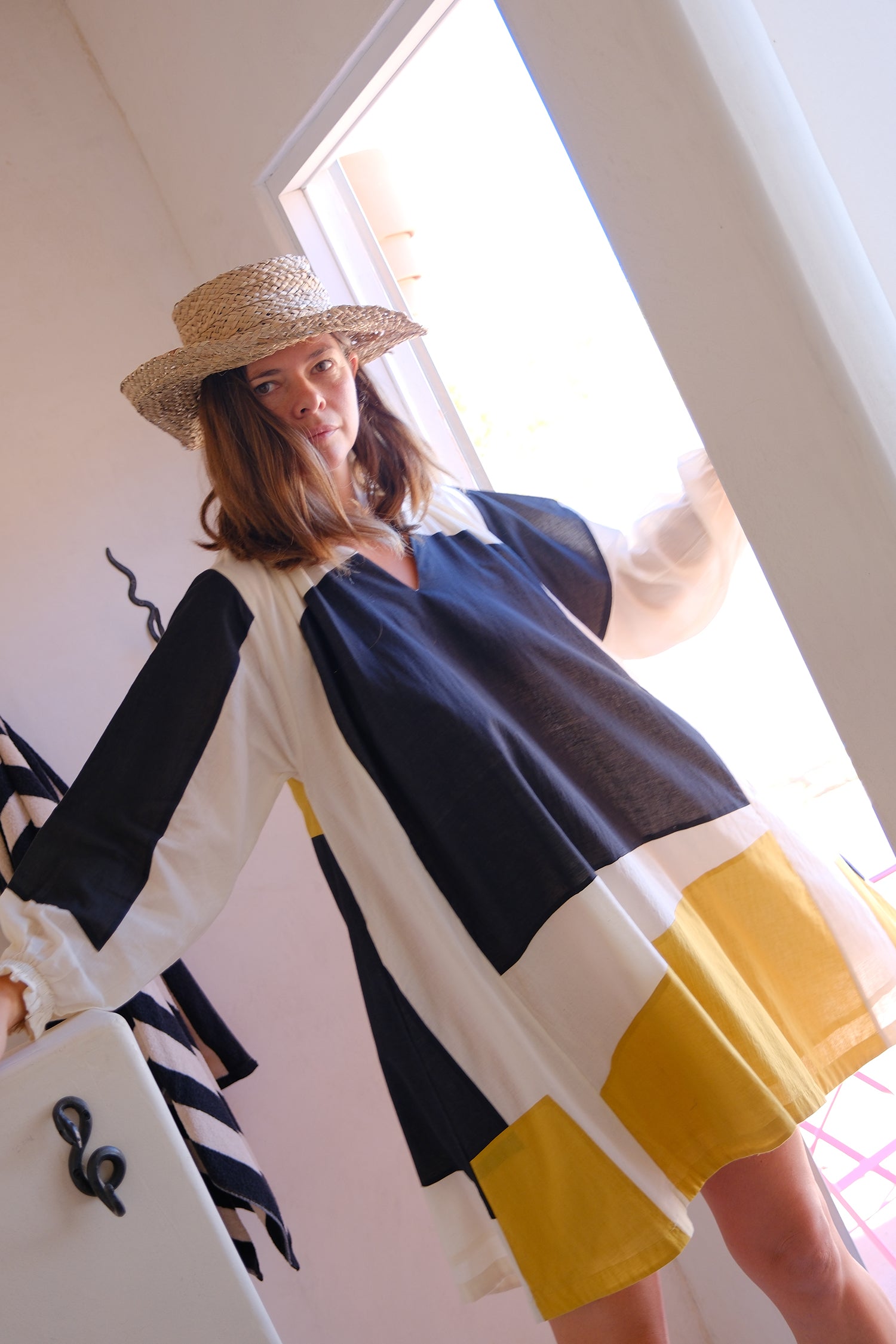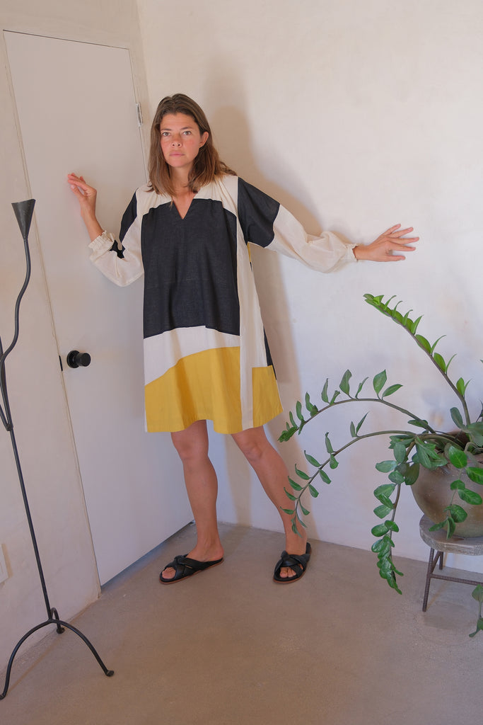 This color-blocked patchwork dress is tailored from soft and natural cotton fabric. It's a modern minimalist piece that exudes free-flowing charm. The unique unstructured shapes, vintage-inspired cuffs with frill details, and gatherings around the neckline make it versatile for any occasion. Whether you're planning a spring holiday or a casual weekend outing, this dress is the perfect choice for a stylish and effortless look.
