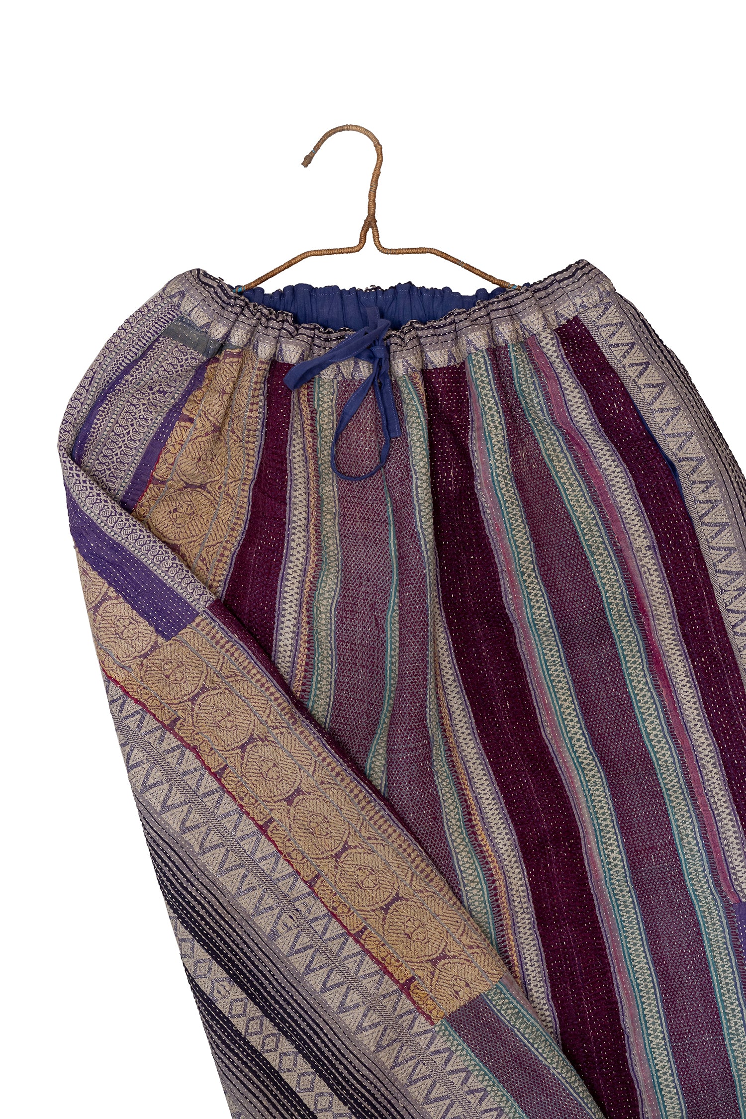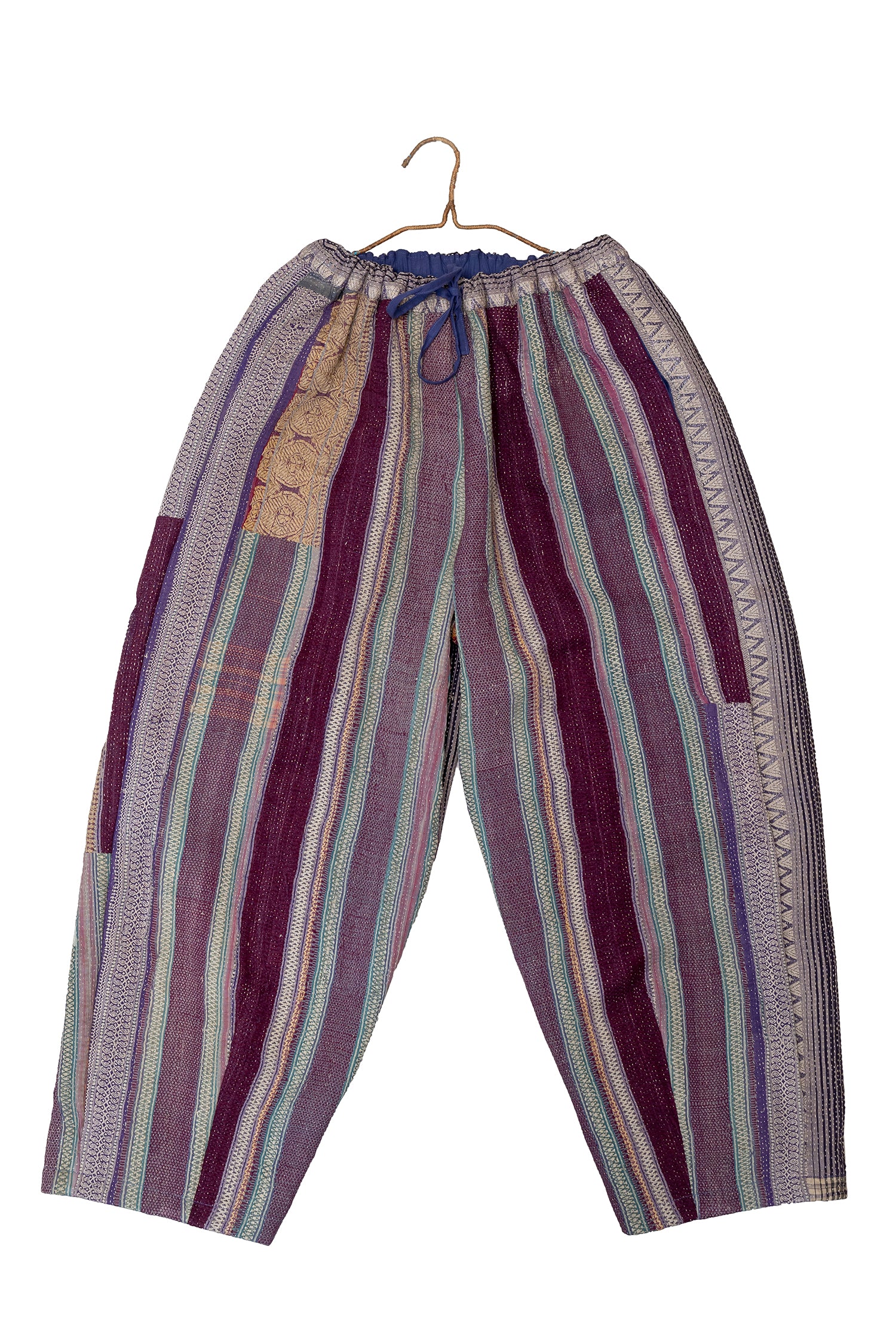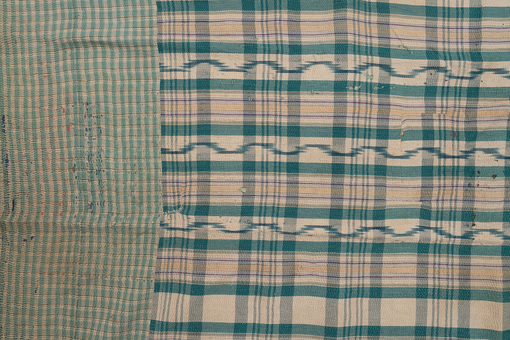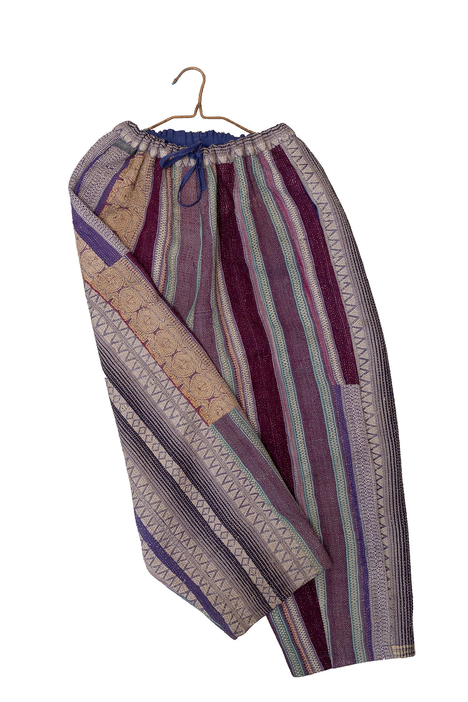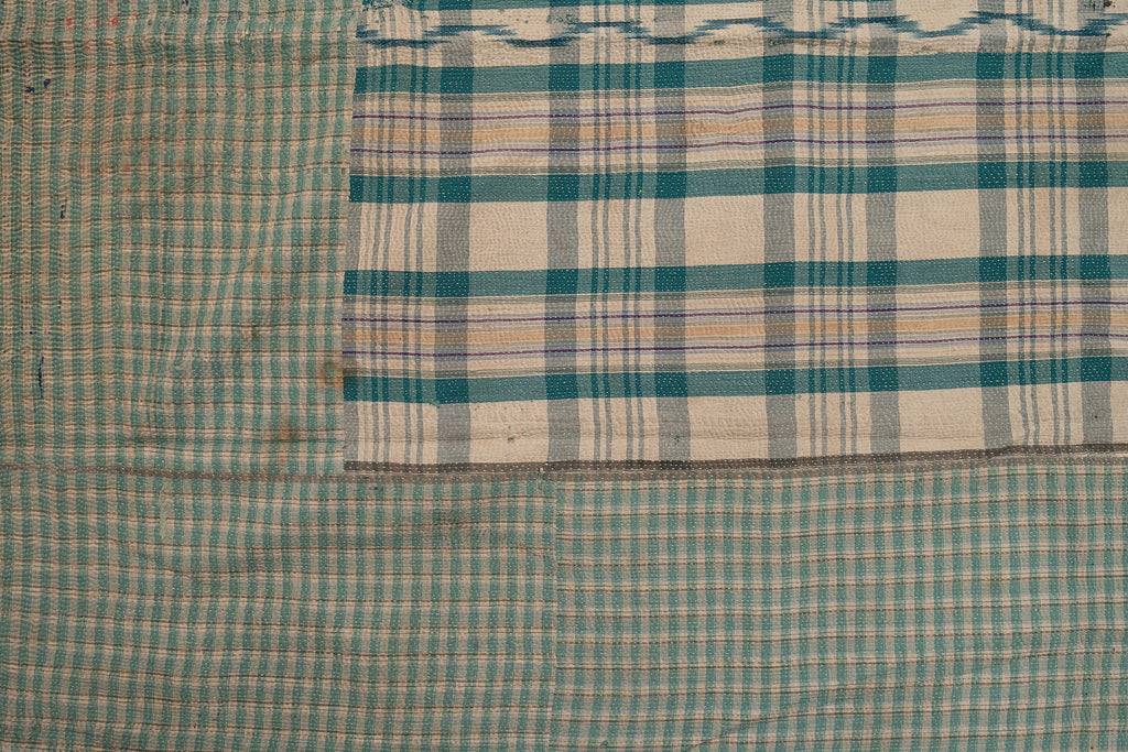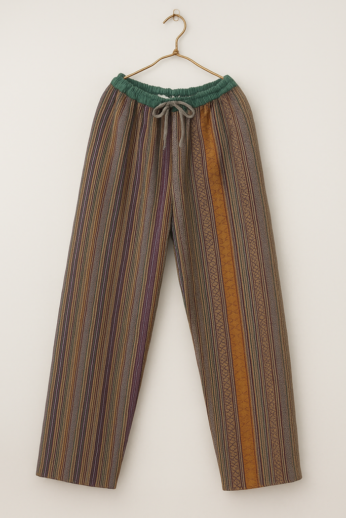 Soft, lived-in, and richly textured, these pants are crafted from vintage kantha quilts in muted grey checks with teal patchwork detailing. Each panel carries years of hand-stitching and quiet artistry, giving the piece its gentle drape and soulful character. Designed for everyday ease, they balance comfort, craft, and the subtle charm of worn-in textiles.