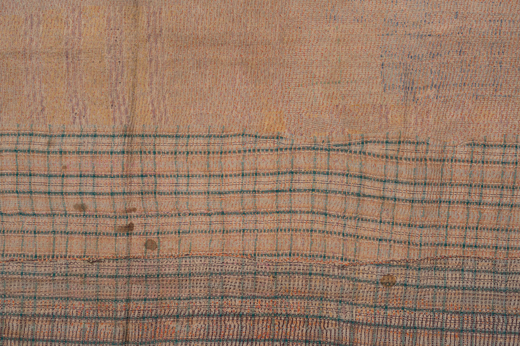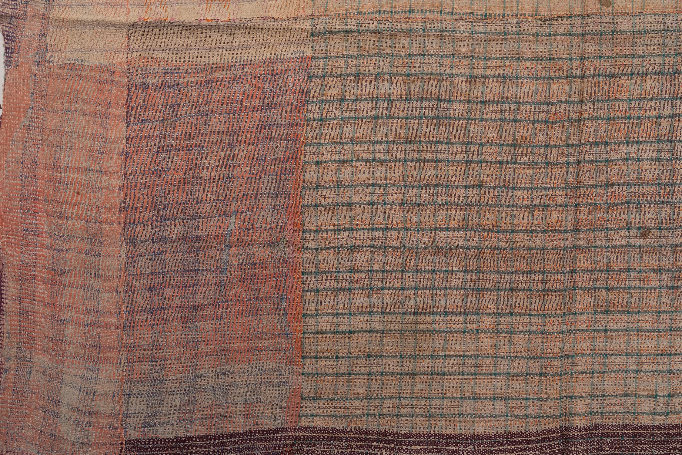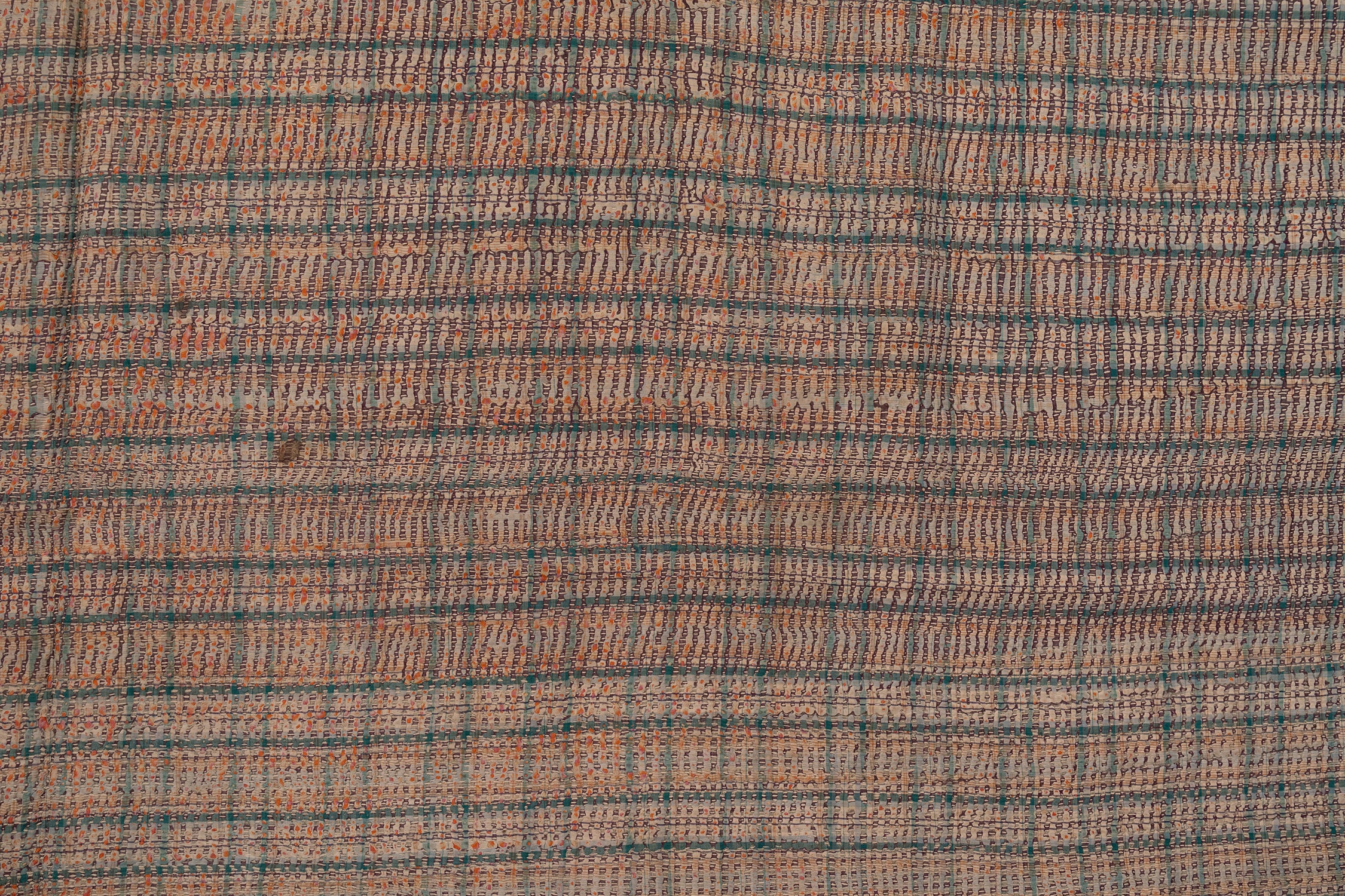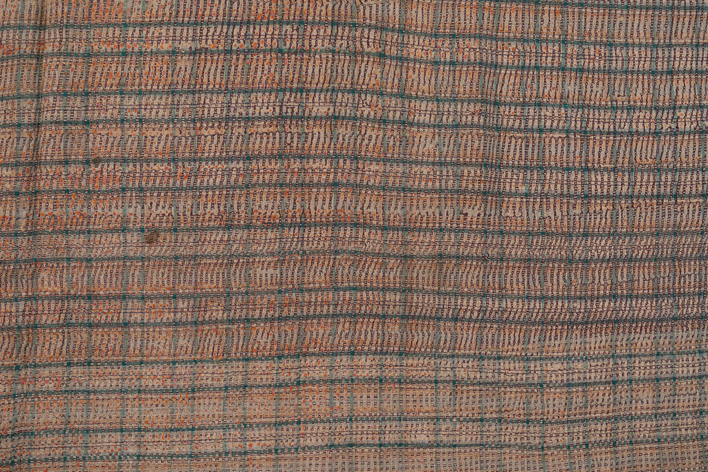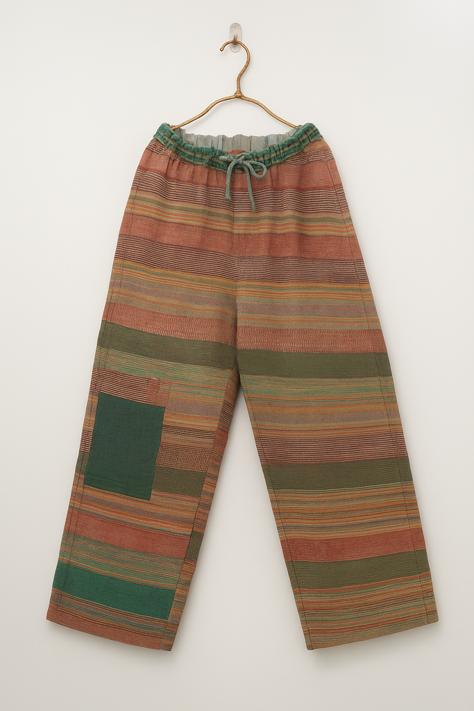 Crafted from vintage kantha quilts, these pants blend teal and sand checks with a hand-patched leg, evoking the spirit of slow journeys and handmade beauty. Relaxed, tactile, and effortlessly wearable through the seasons.