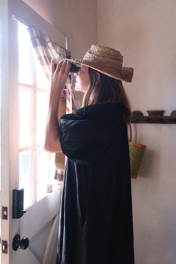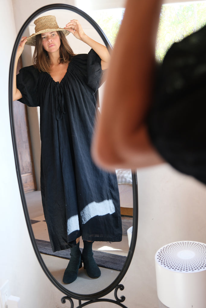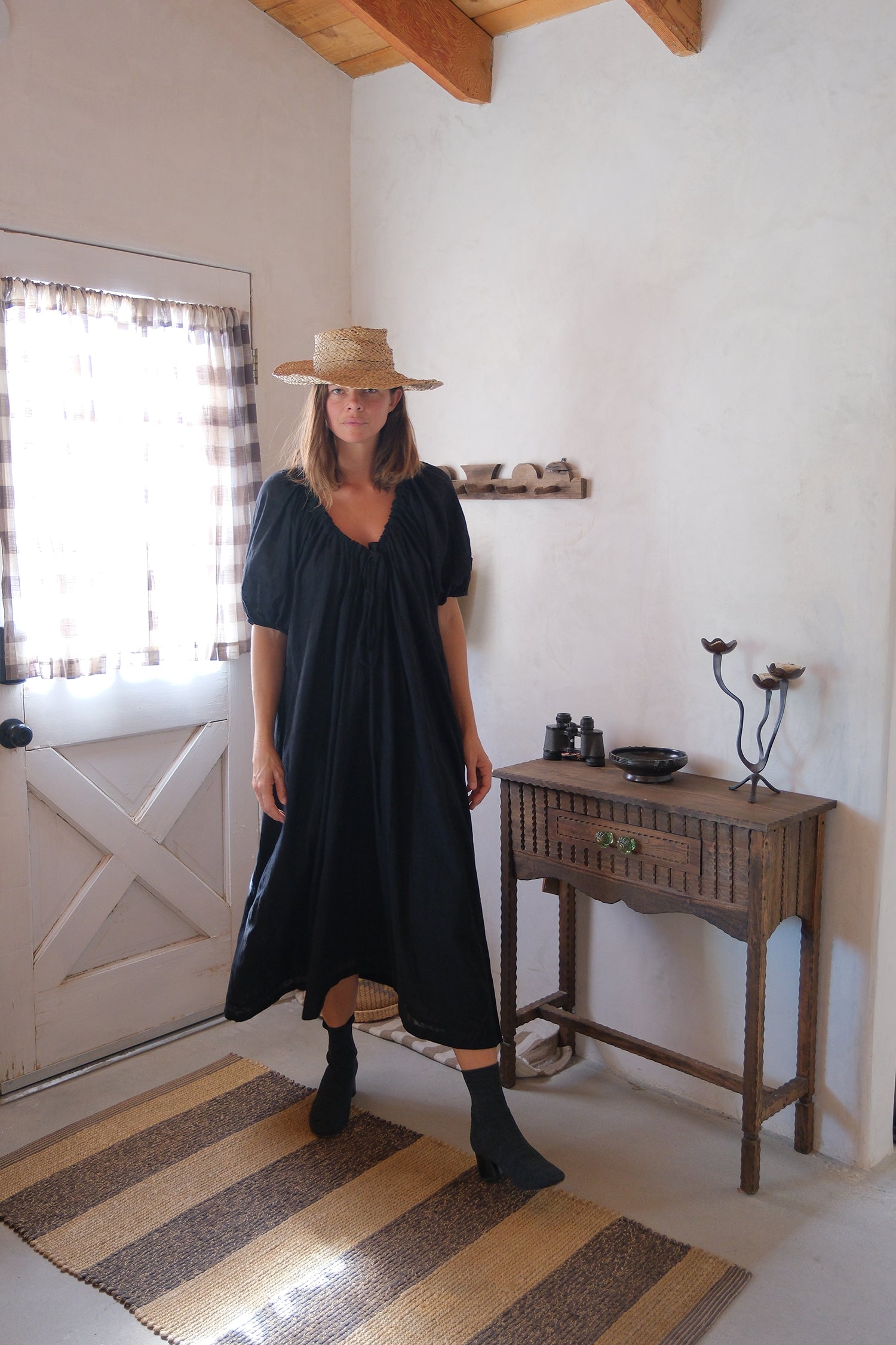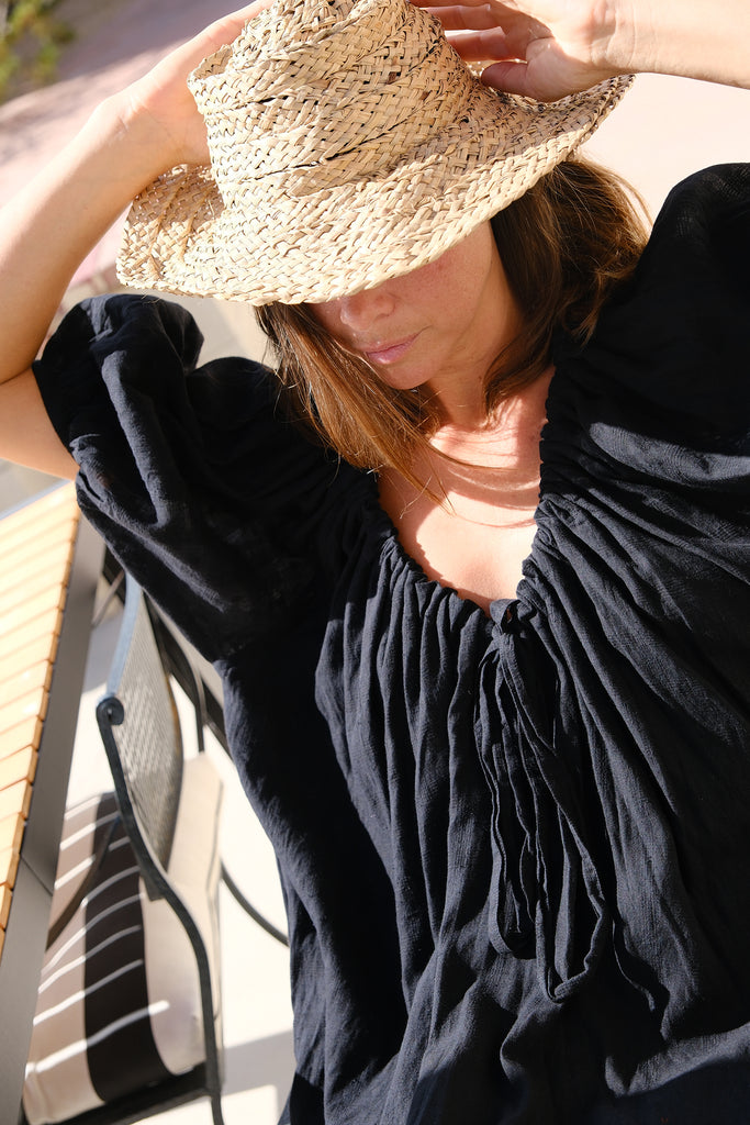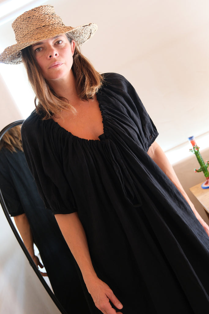 This statement black dress designed in collaboration with meredith peck combines elegance with a comfortable, flowing style. It features an adjustable V-neckline and a beautifully ruched bodice, while the romantic, puffy short sleeves add a touch of flair. This versatile piece can be dressed up with statement jewelry and heels for an evening event or paired with sandals for a relaxed, daytime look.
