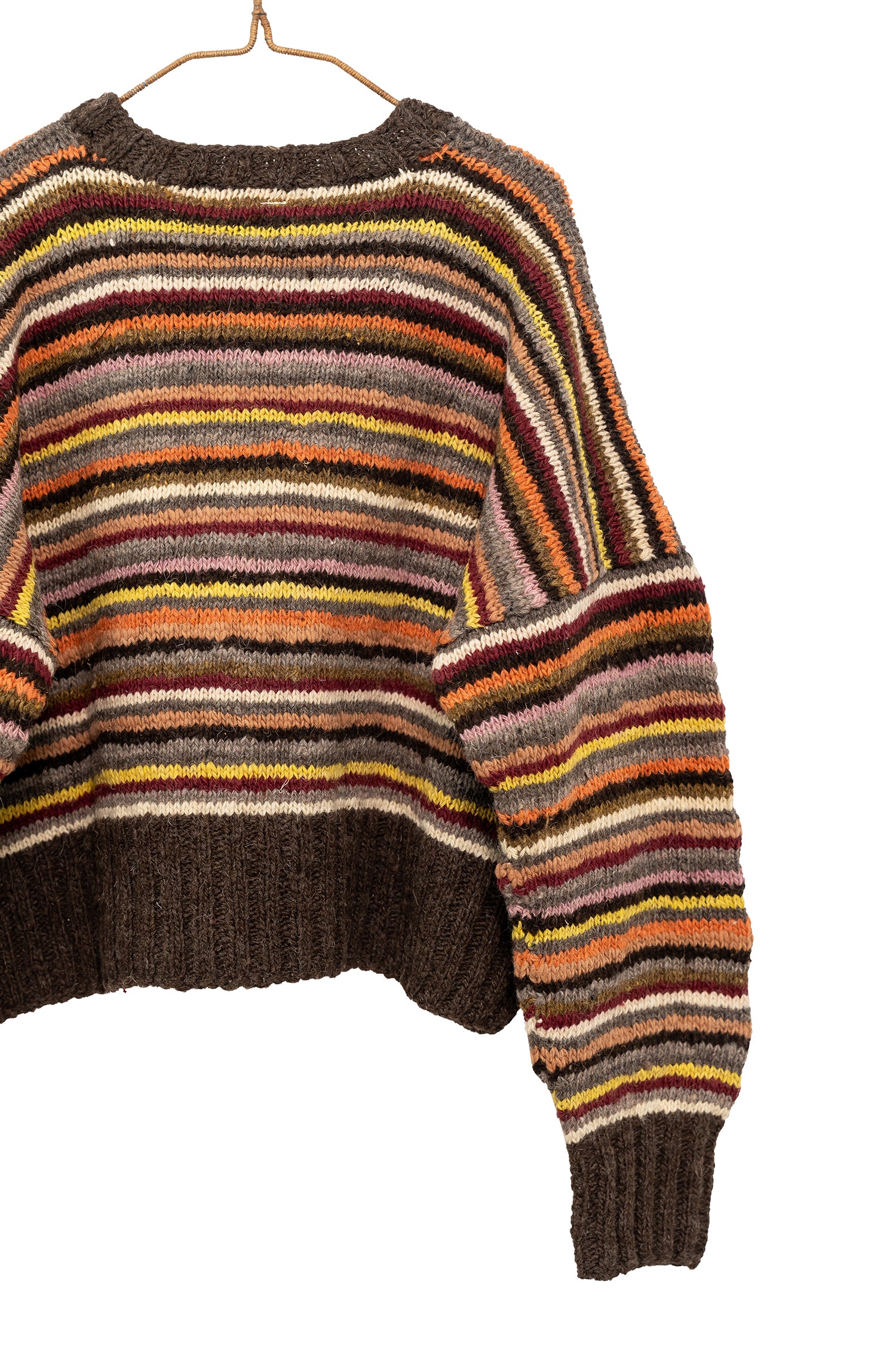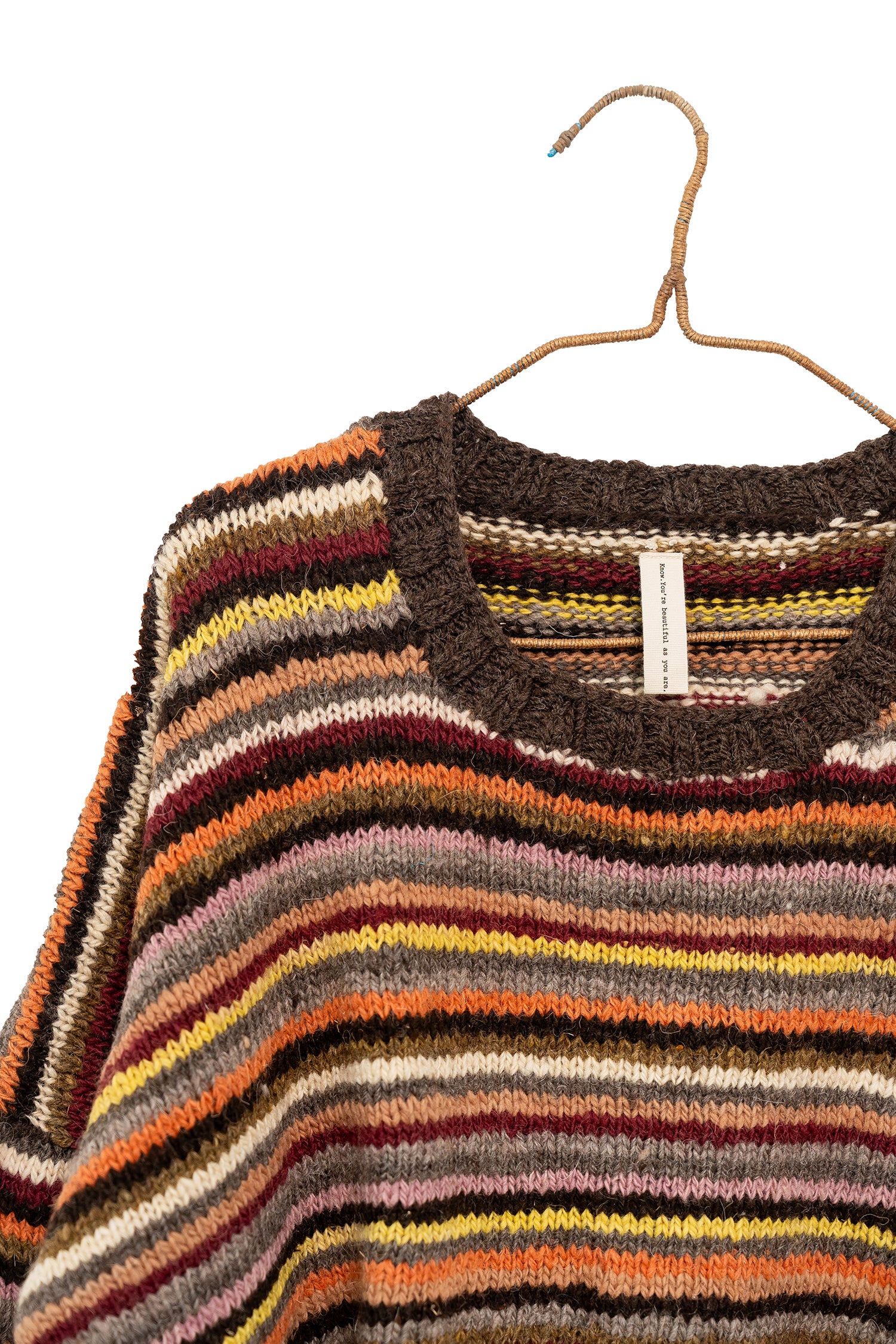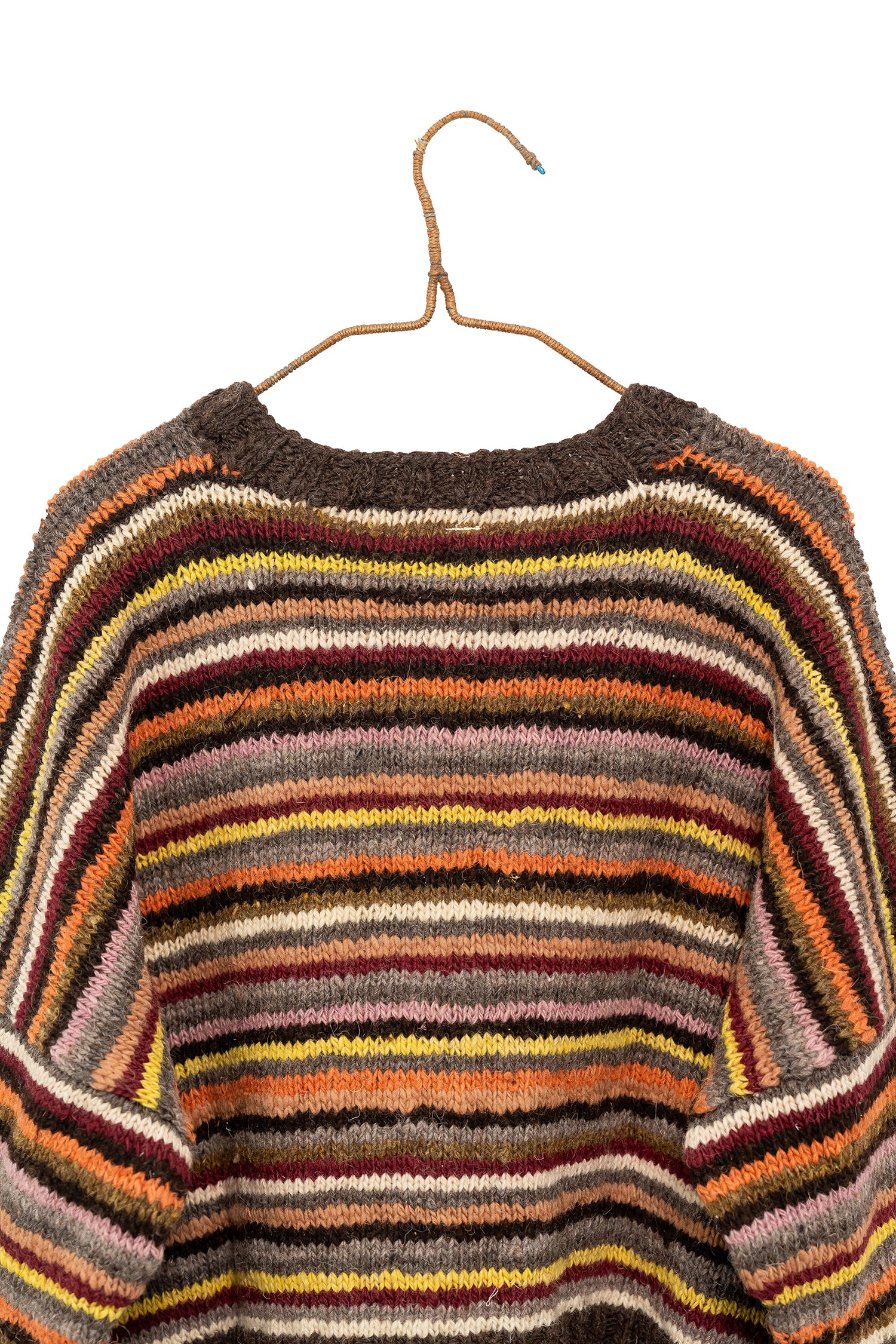 Embrace the charm of the mountains with our the Rustfield Sweater. The Sweater is hand-spun and hand-knit using naturally dyed Himalayan wool. Its stripes echo rustic fields at dusk—rich browns, muted greens, and ember-like oranges blending into a landscape of texture and warmth.