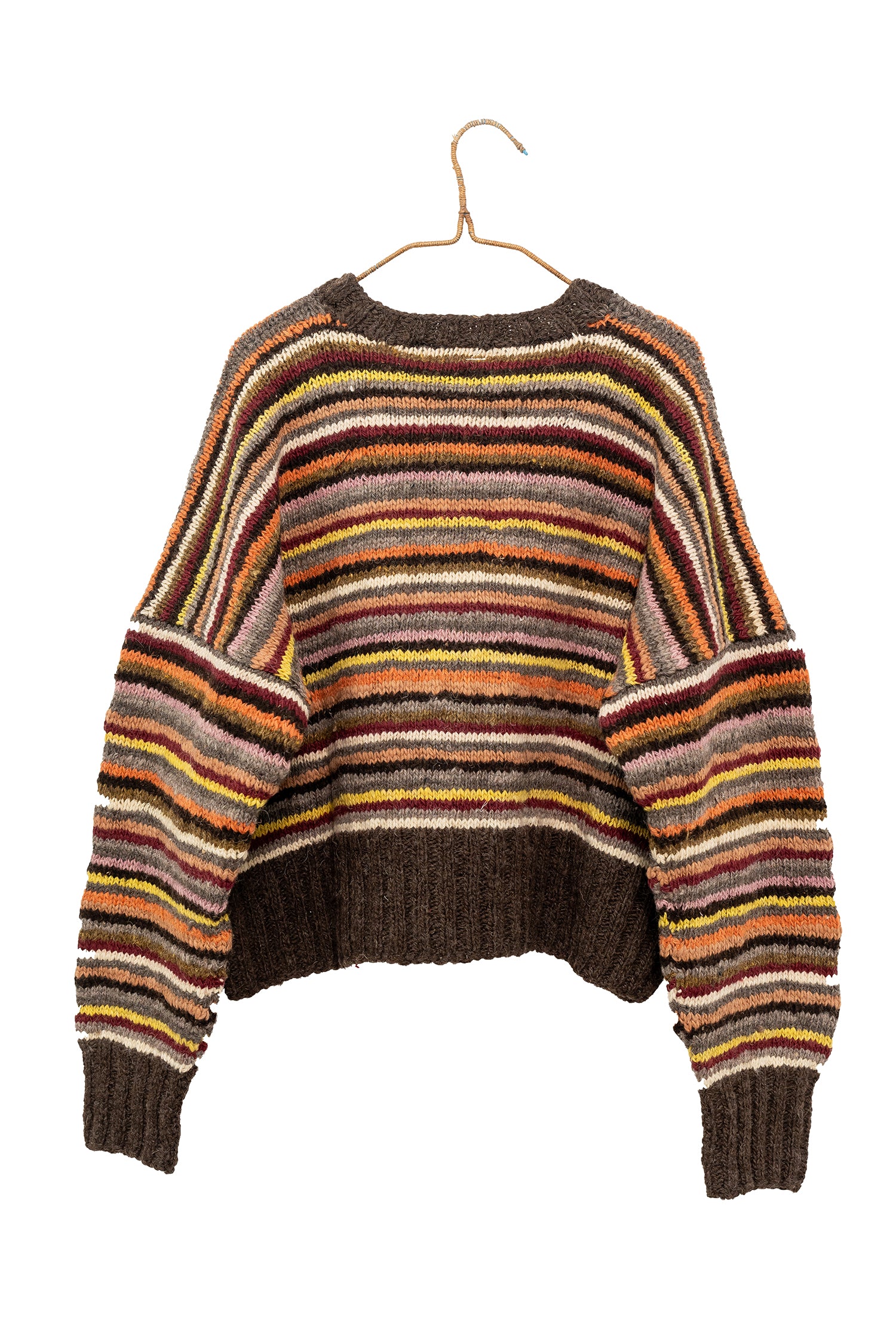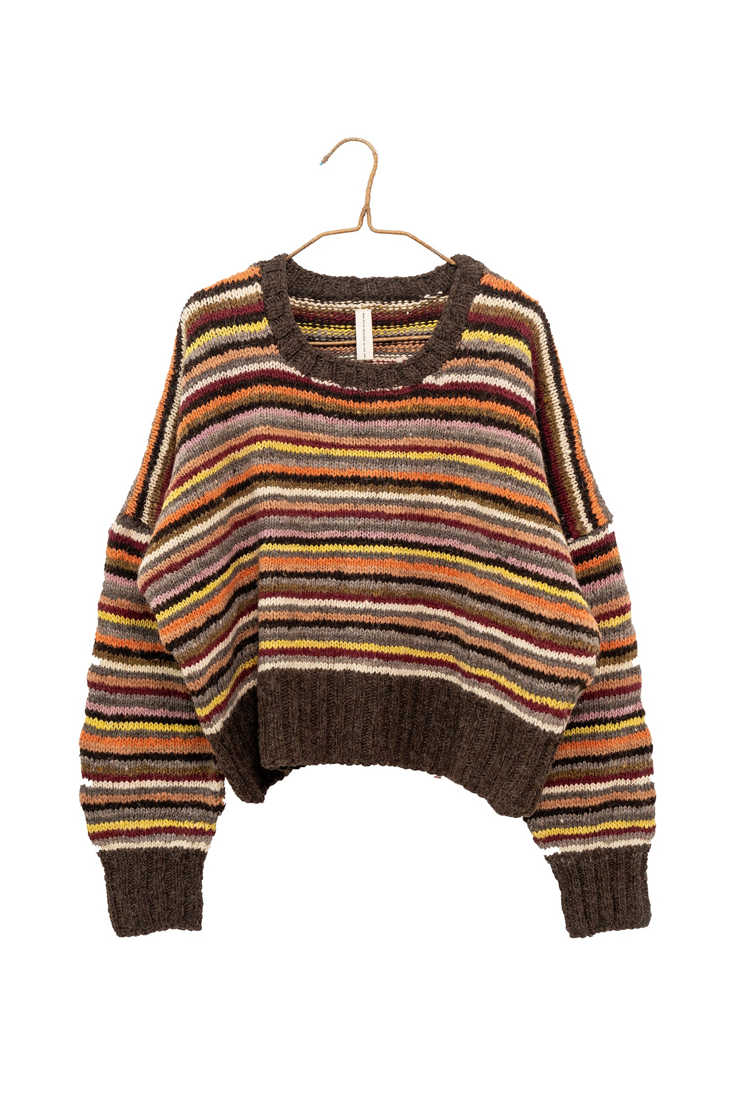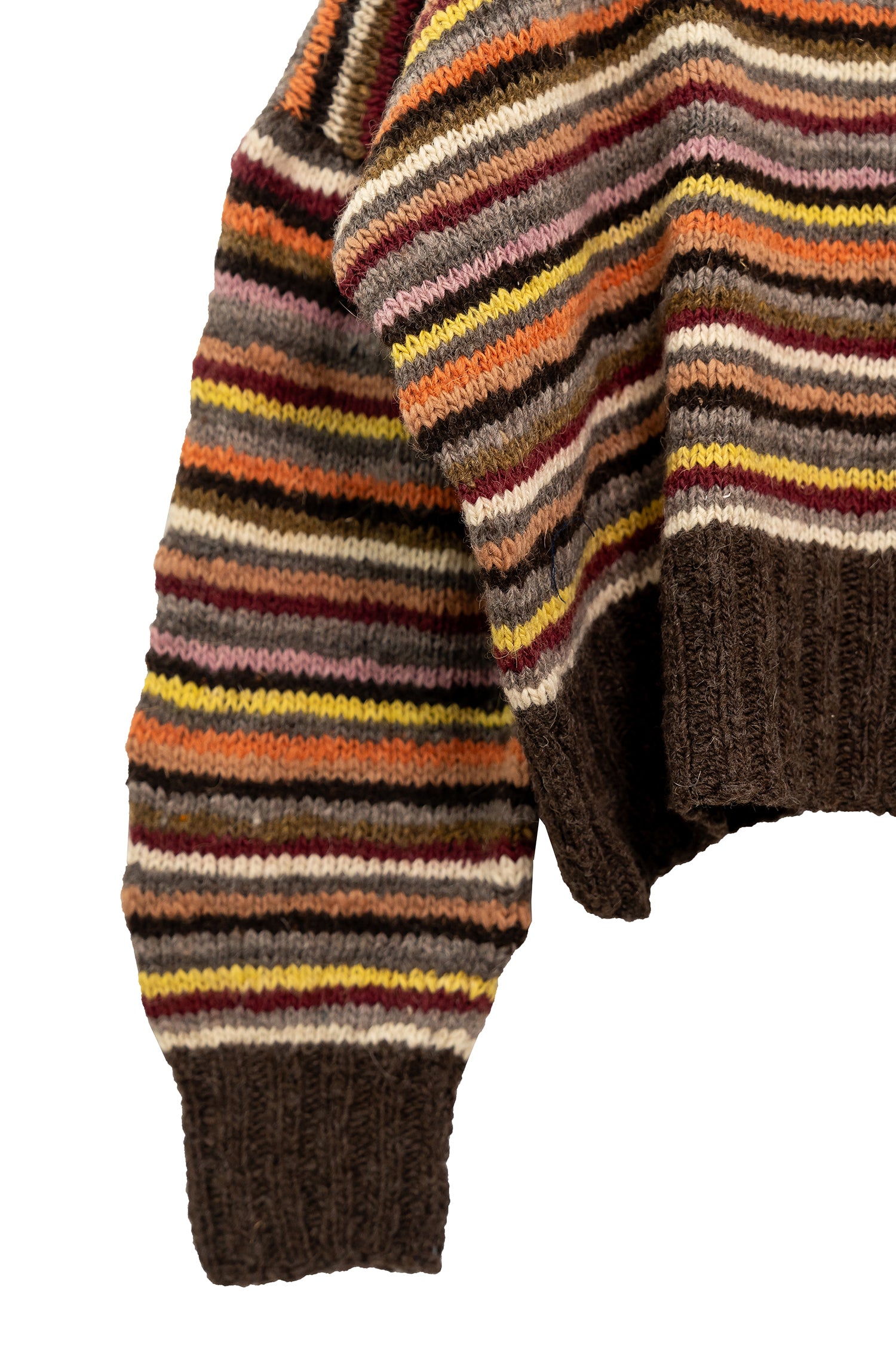 Embrace the charm of the mountains with our the Rustfield Sweater. The Sweater is hand-spun and hand-knit using naturally dyed Himalayan wool. Its stripes echo rustic fields at dusk—rich browns, muted greens, and ember-like oranges blending into a landscape of texture and warmth.