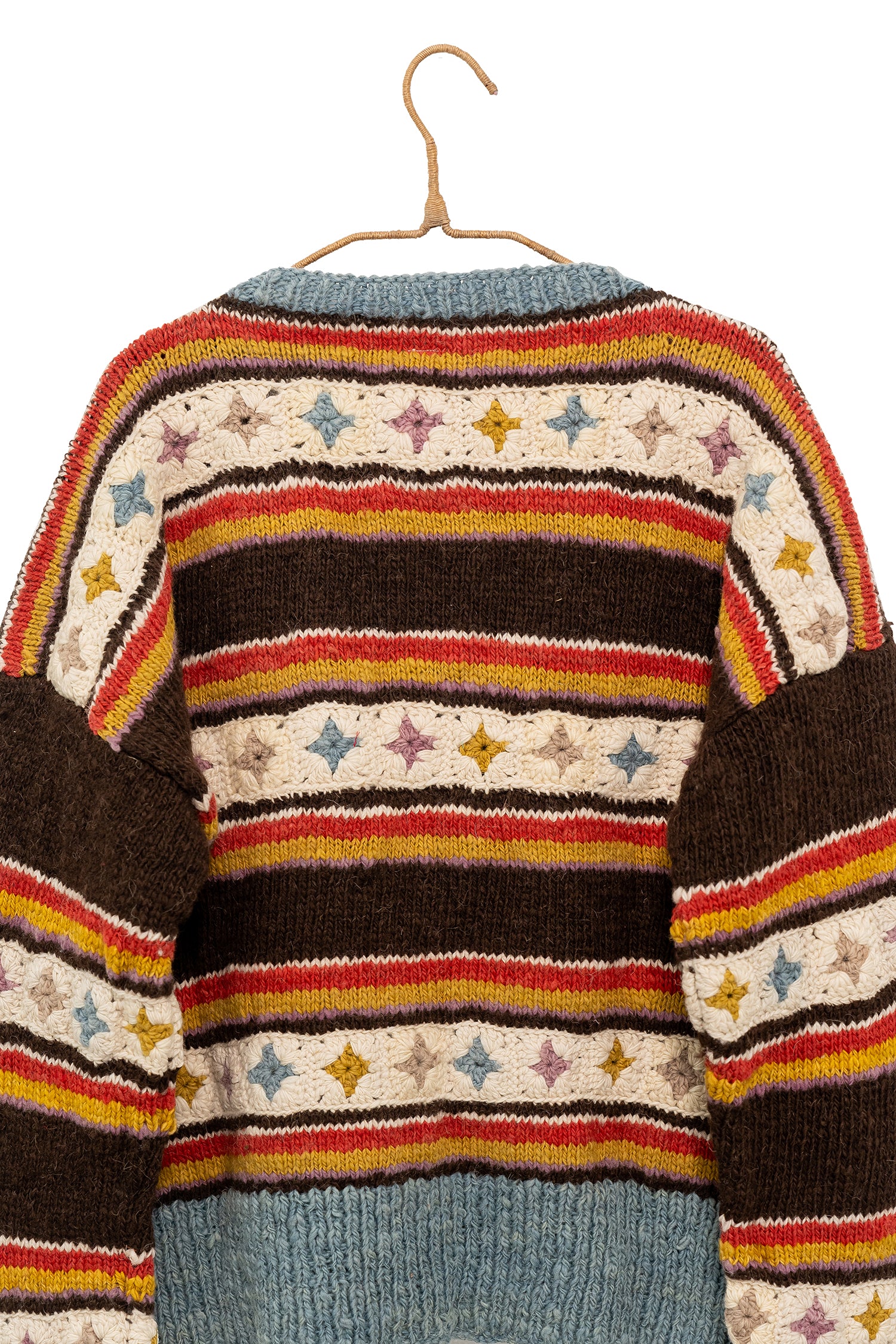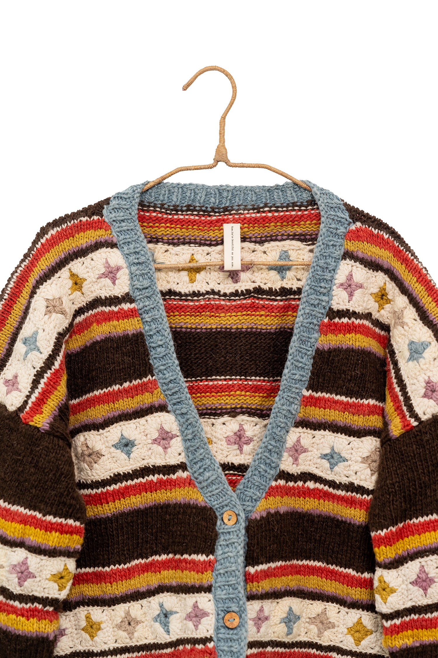 Embrace the warmth of the highlands with our Startrail Cardigan. Crafted from naturally dyed Himalayan wool, this hand-spun, hand-knit piece features a charming mix of stripes and star-stitched crochet panels — each one echoing the colors and textures of mountain nights, forest paths, and crisp winter skies. Every cardigan carries its own character, shaped slowly by the skilled hands of our women artisans.