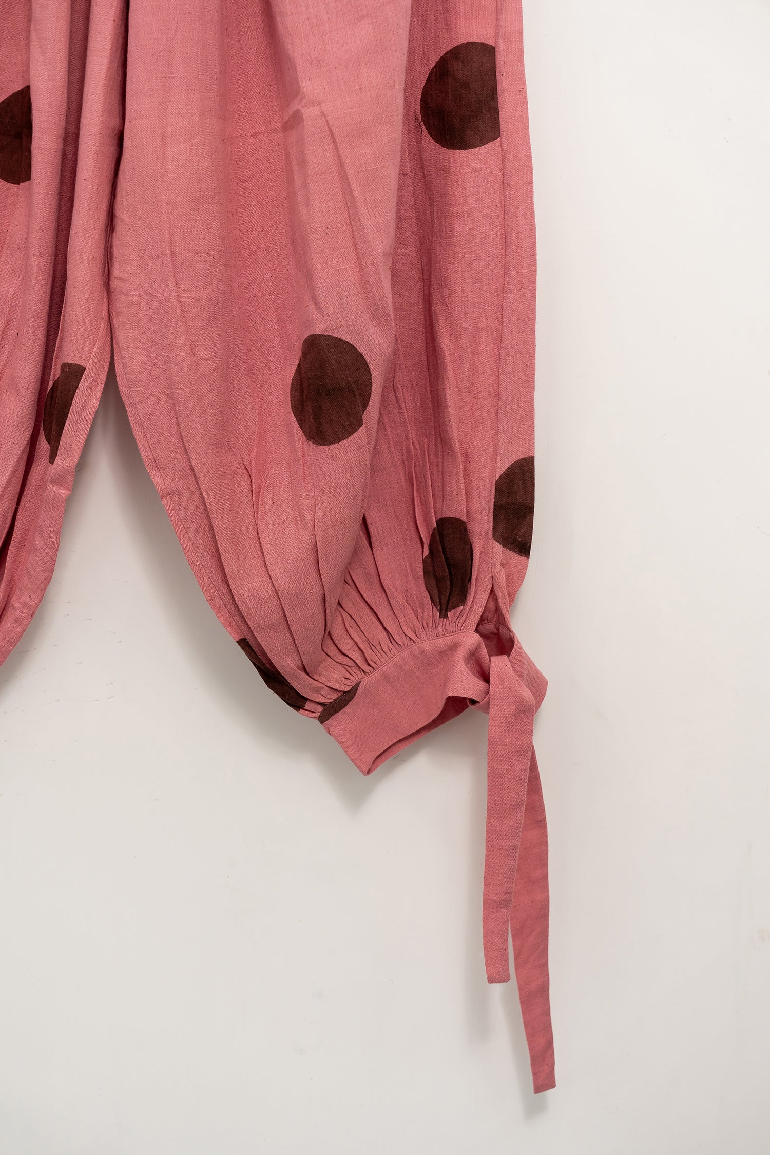 Full of ease and character, these voluminous pants feature playful hand-blocked dots in deep cocoa printed on an airy, muted rose/mauve fabric. The design incorporates a comfortable elastic waistband and adjustable ankle ties, making them as comfortable as they are expressive—a perfect, eye-catching complement to simple tops or shirts.