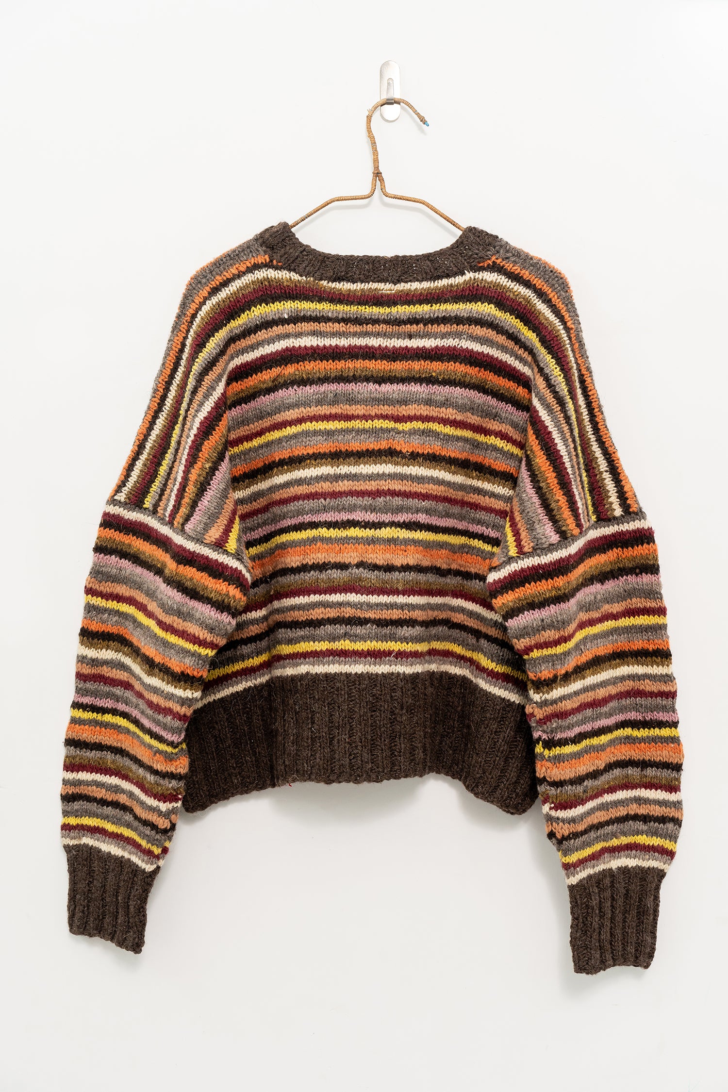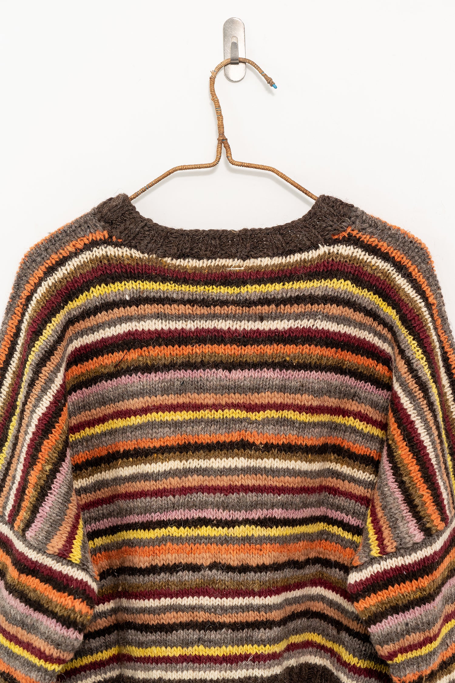 Embrace the charm of the mountains with our the Rustfield Sweater. The Sweater is hand-spun and hand-knit using naturally dyed Himalayan wool. Its stripes echo rustic fields at dusk—rich browns, muted greens, and ember-like oranges blending into a landscape of texture and warmth.