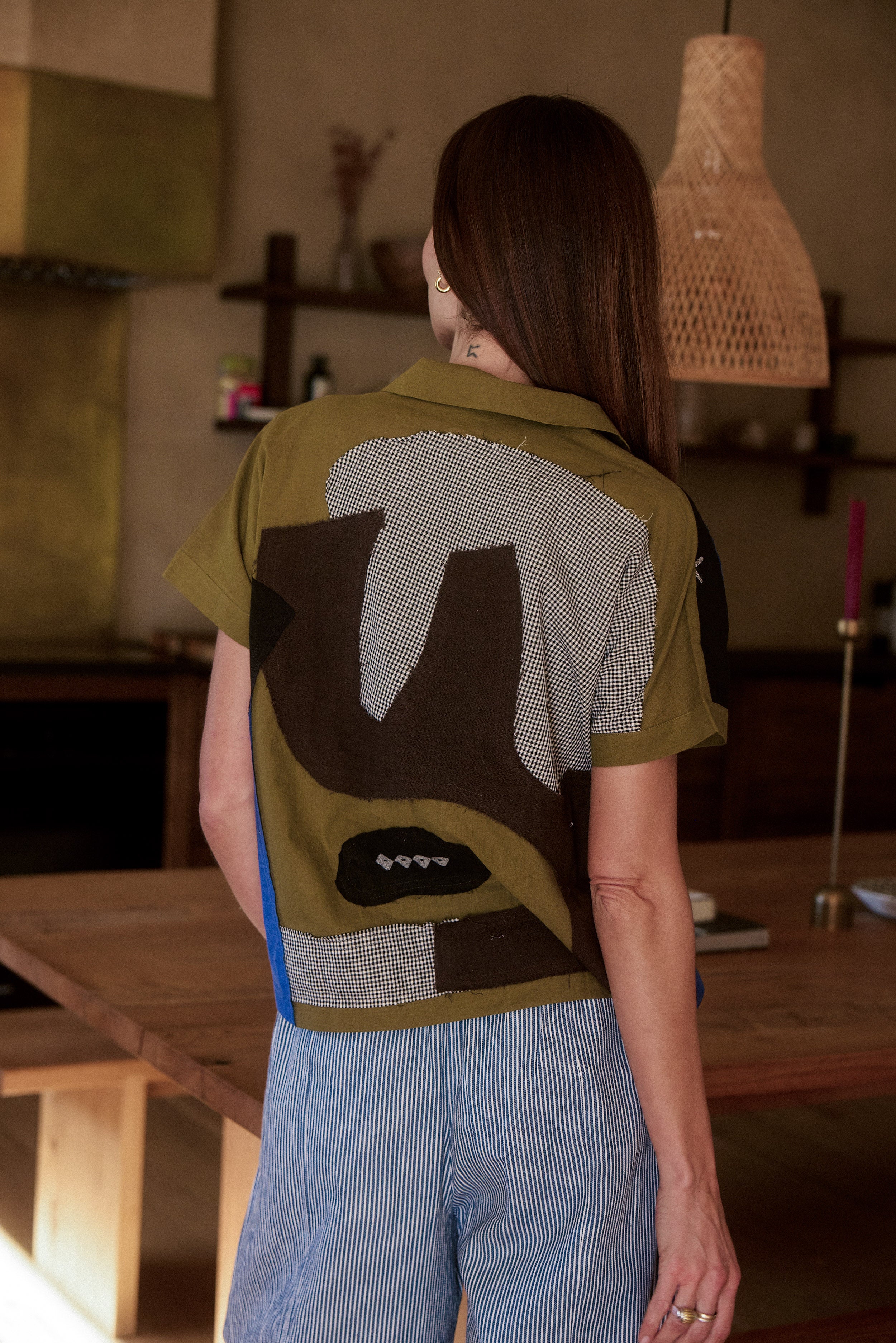 Handwoven cotton pieces are thoughtfully cut and assembled into our signature relaxed silhouette. Stripes meet solids, checks meet curves — creating movement across the body while maintaining structure. Lightweight yet substantial, it transitions seamlessly from statement to staple.