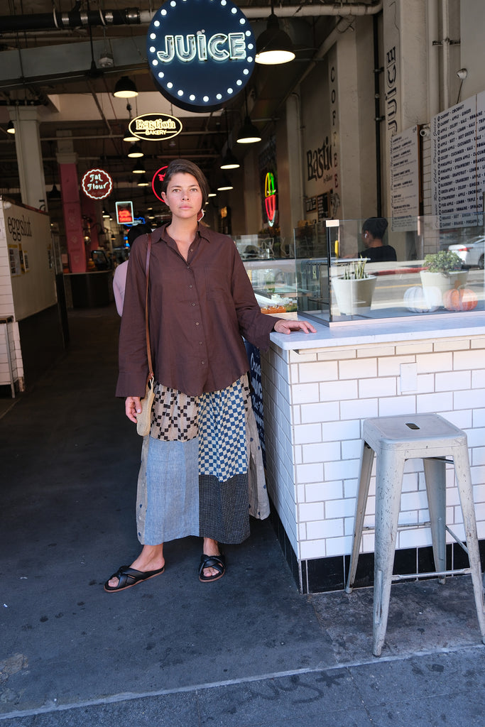 A true celebration of contrast and craft, this bohemian patchwork skirt is made from a variety of solid and patterned fabrics. It features a mix of black and white checks, blue and white checks, and a panel with large blue polka dots. Each fabric tells its own story—woven together in a flowing silhouette that moves with you. Pair it with a solid black or white top to let the skirt be the focal point, or with a simple sandstone top for a more relaxed feel.