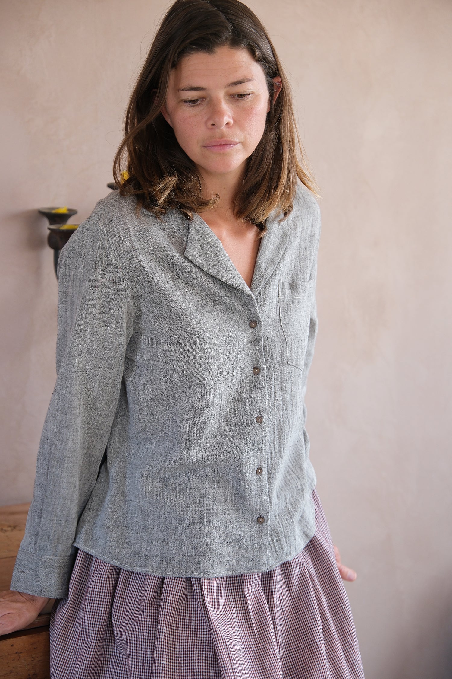 A timeless staple in earthy charcoal tones, this shirt is crafted from handwoven cotton with a linen-like texture. Designed for comfort, it features a relaxed collar, drop shoulders, and soft cuffs.