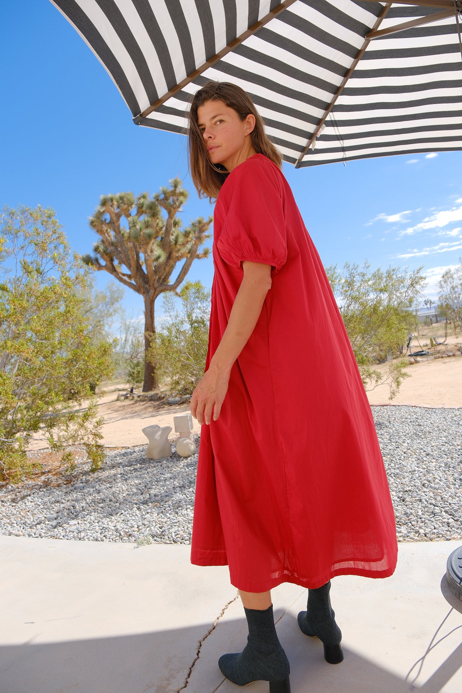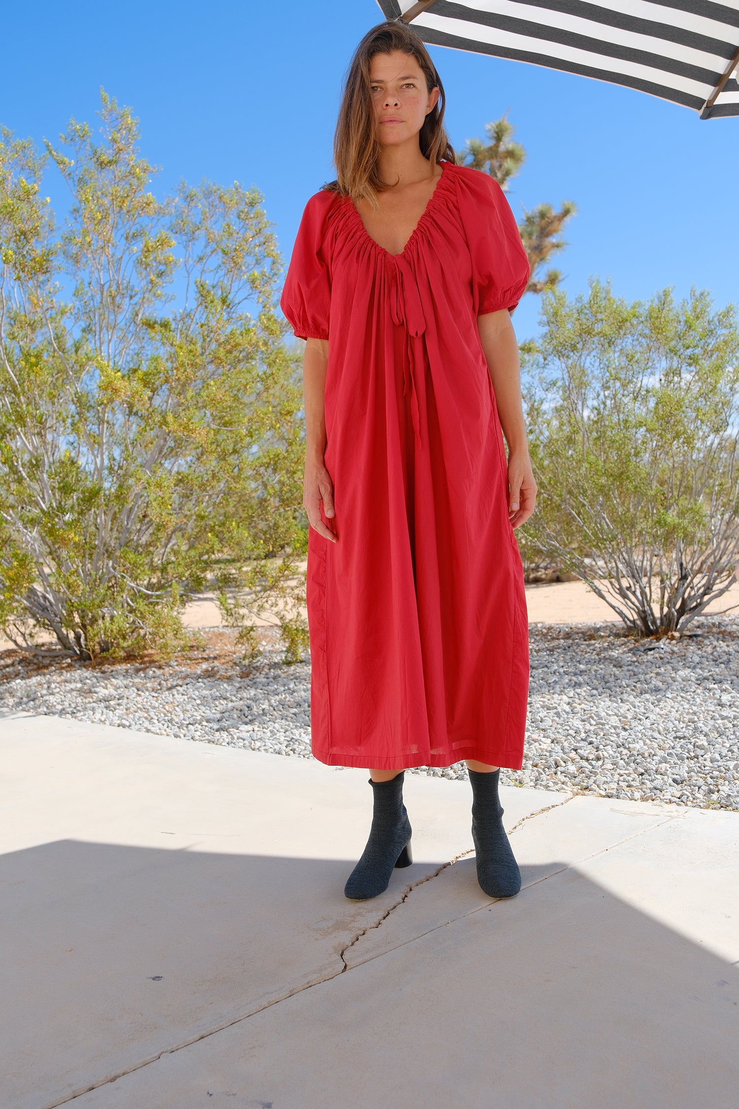 In collaboration with Meredith Peck, this elegant red dress has a beautiful drape and a comfortable, flowing style. It features a deep, adjustable V-neckline with a front tie-up, a ruched bodice, and romantic puffy short sleeves. The relaxed fit and mid-calf length make it a versatile choice for any occasion.