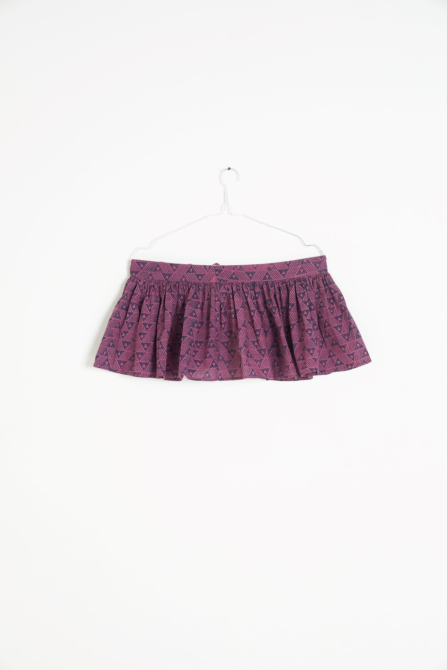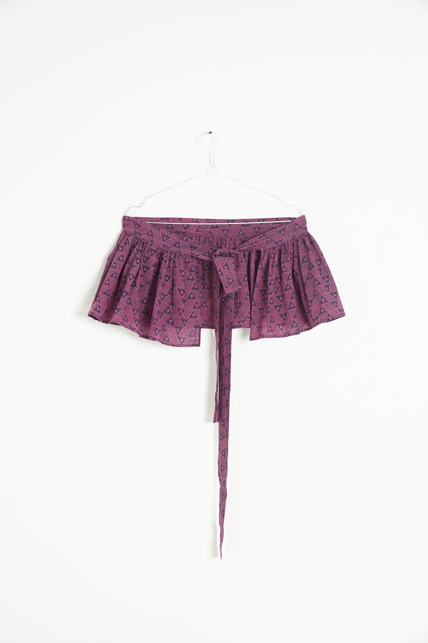 This is a statement piece for any wardrobe. Hand block-printed with a striking geometric pattern in shades of magenta and navy, this ruffle tie-up features a layered frill that creates a voluminous silhouette and ties at the front for a custom fit. Pair it with a simple camisole and tailored trousers or layer it over a dress to instantly elevate your look.