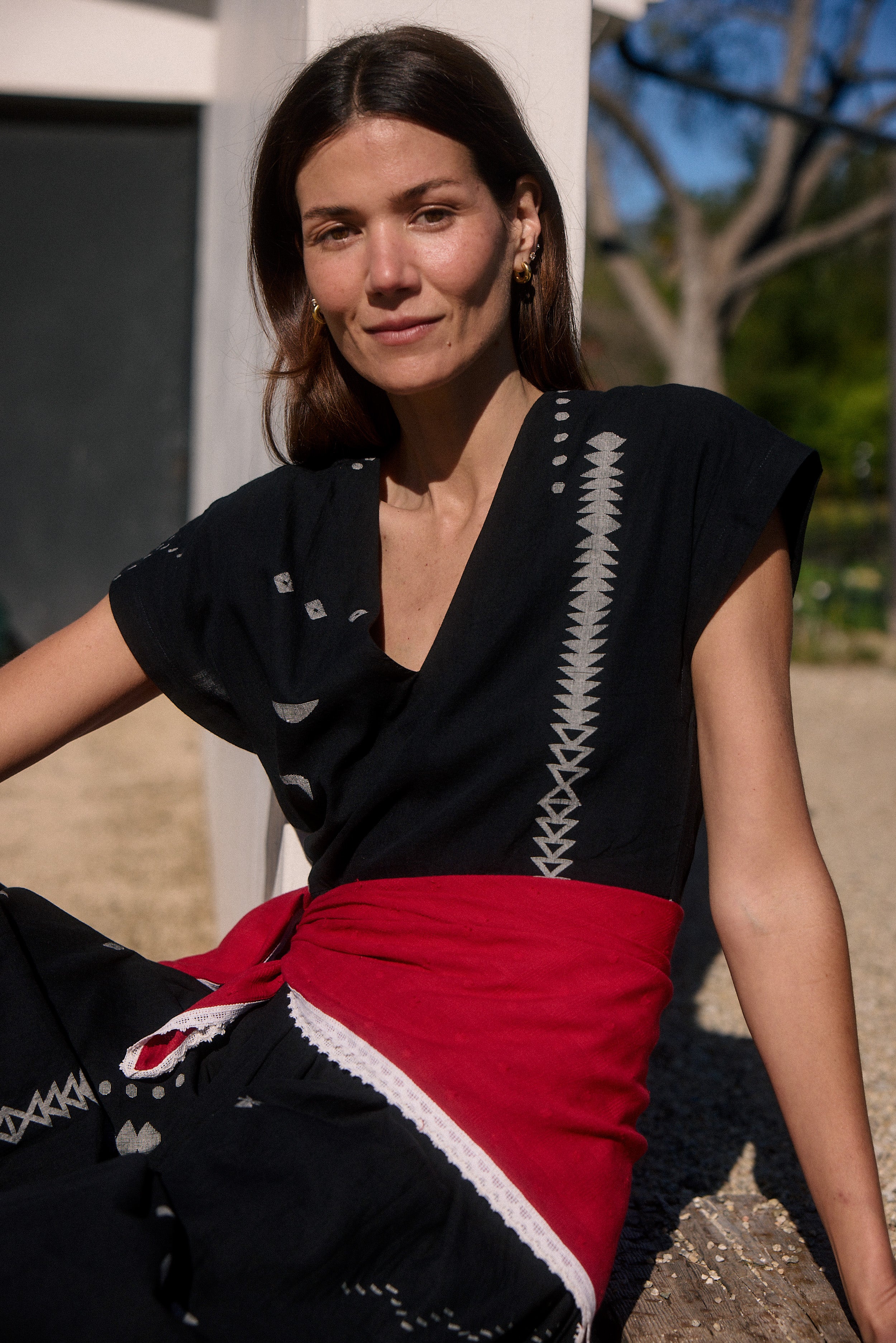 - Deep crimson Jamdani handwoven cotton with intricate crochet lace detailing.