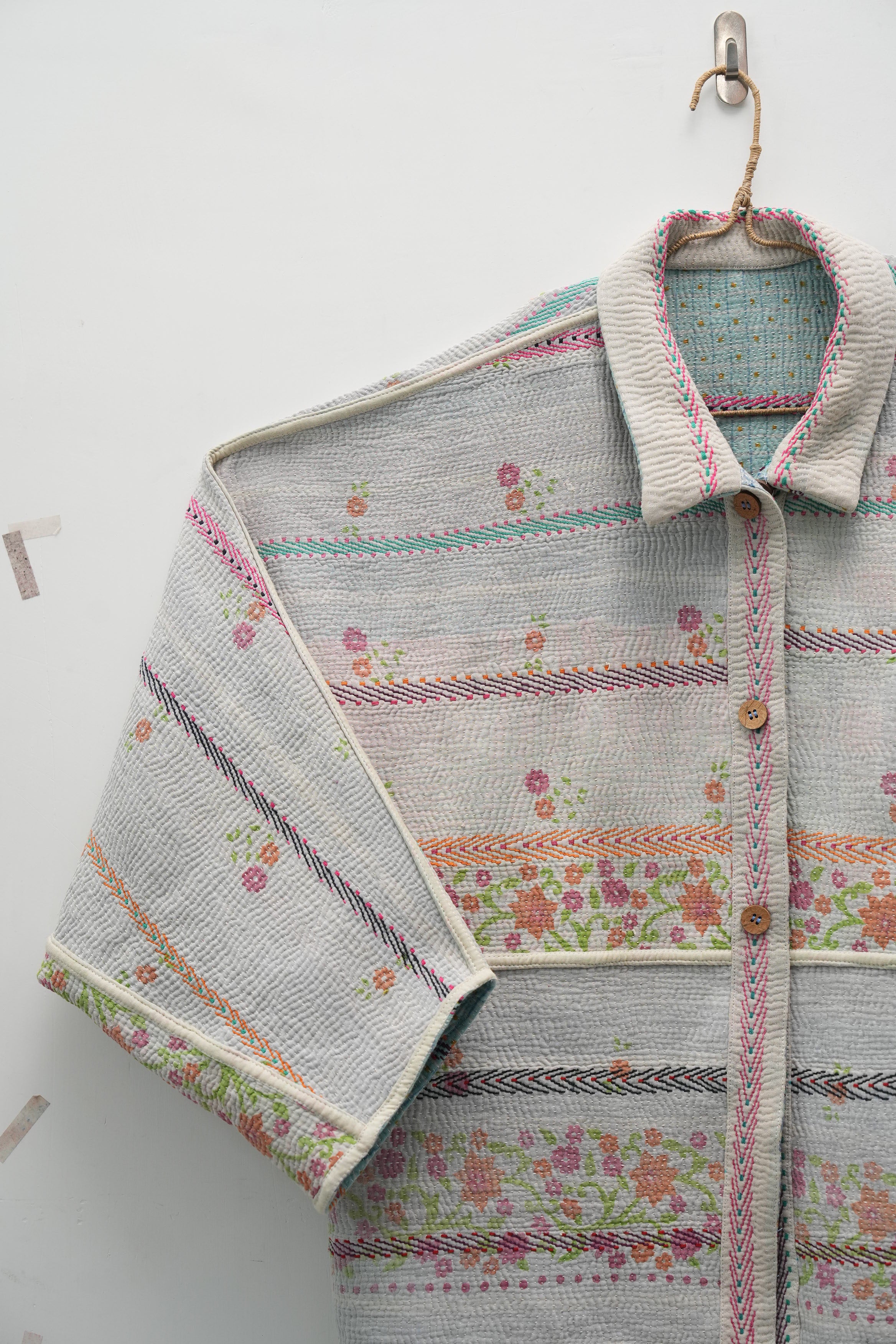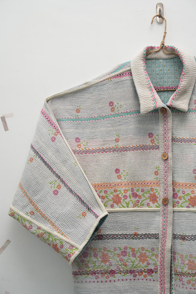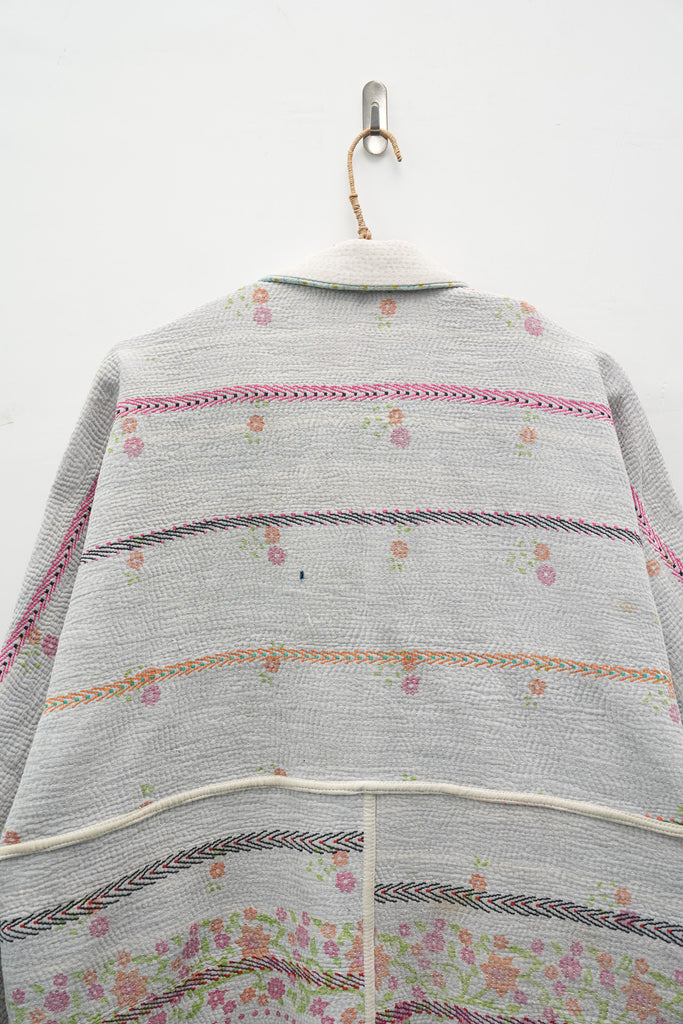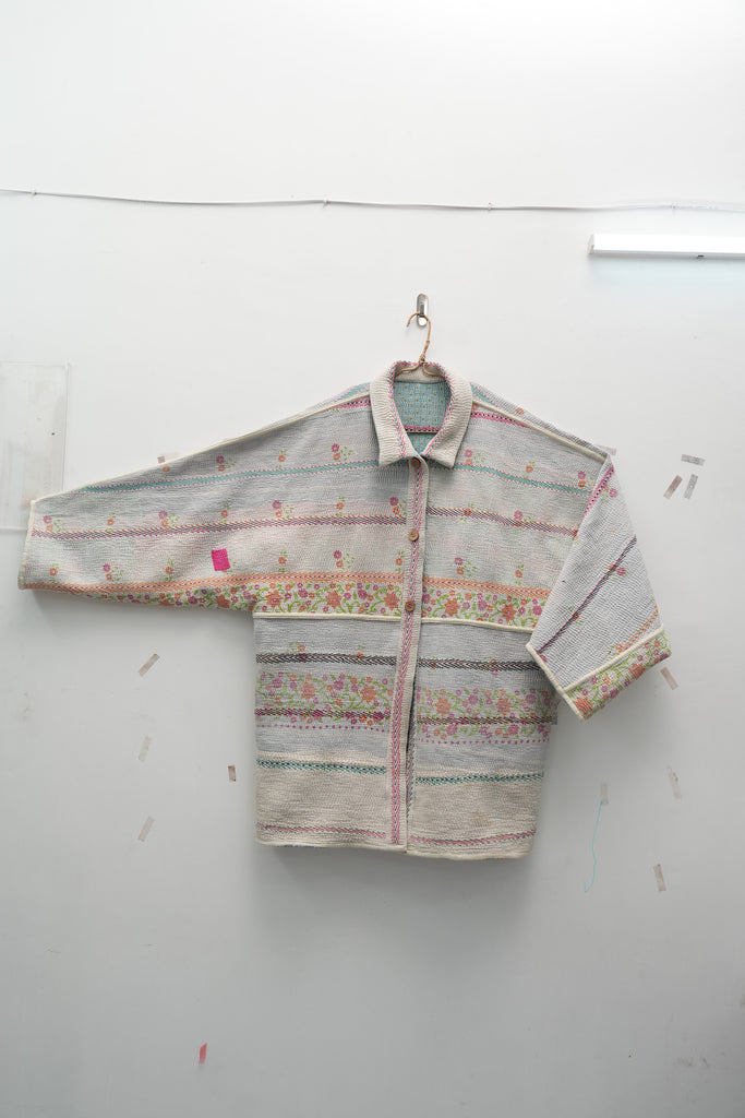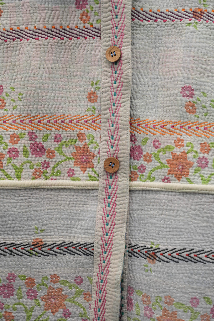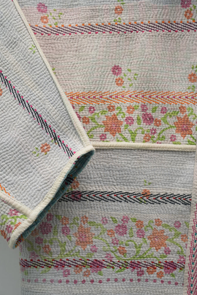 An heirloom in motion — stitched from vintage kantha quilts, this jacket carries delicate floral bands and soft hues of ivory, pink, and mint. Lightweight yet cozy, it’s perfect for fall layering and quiet winter mornings.