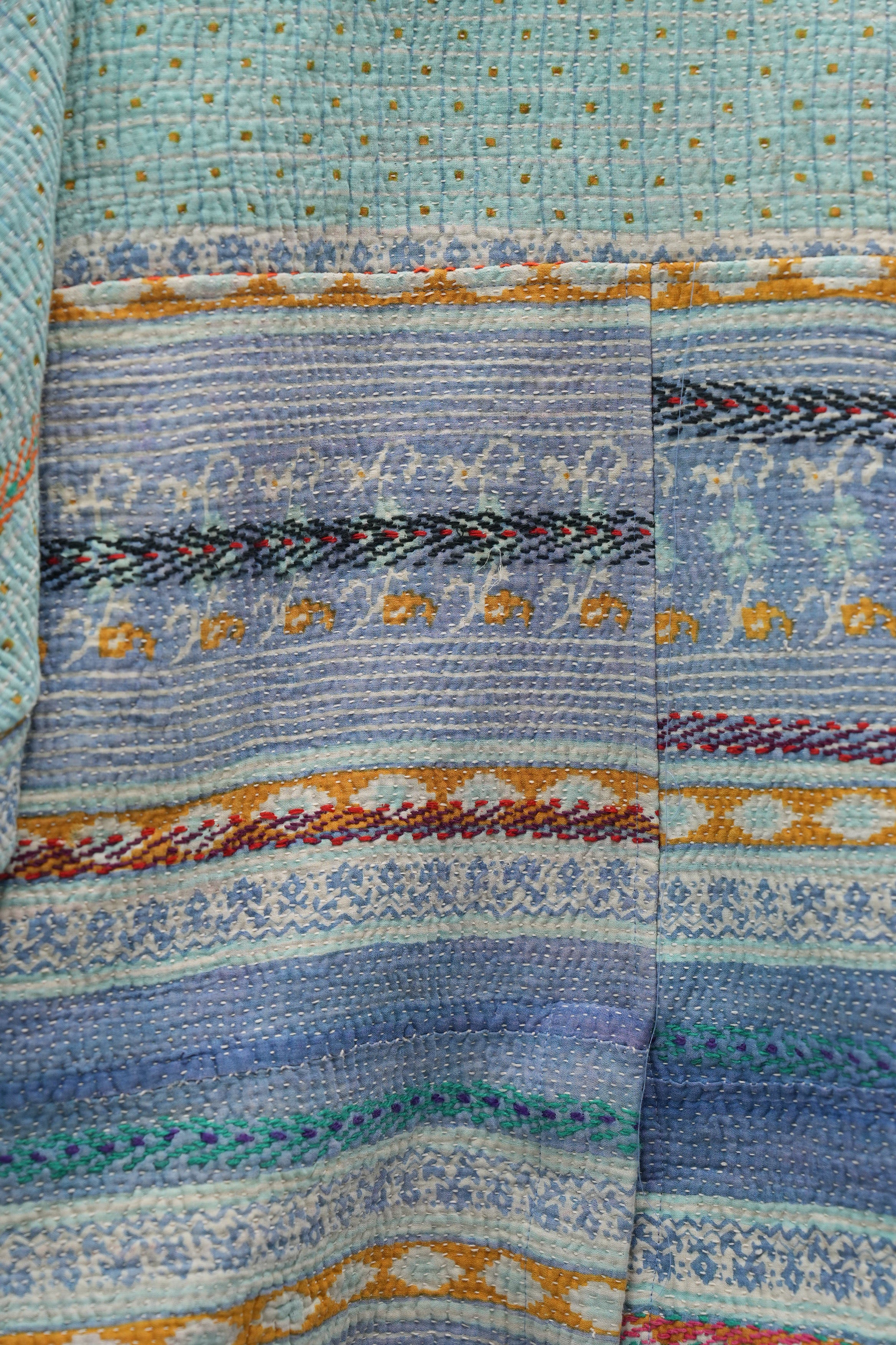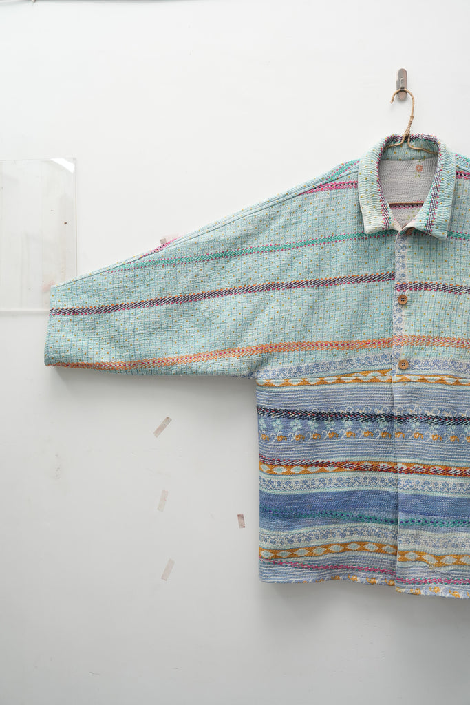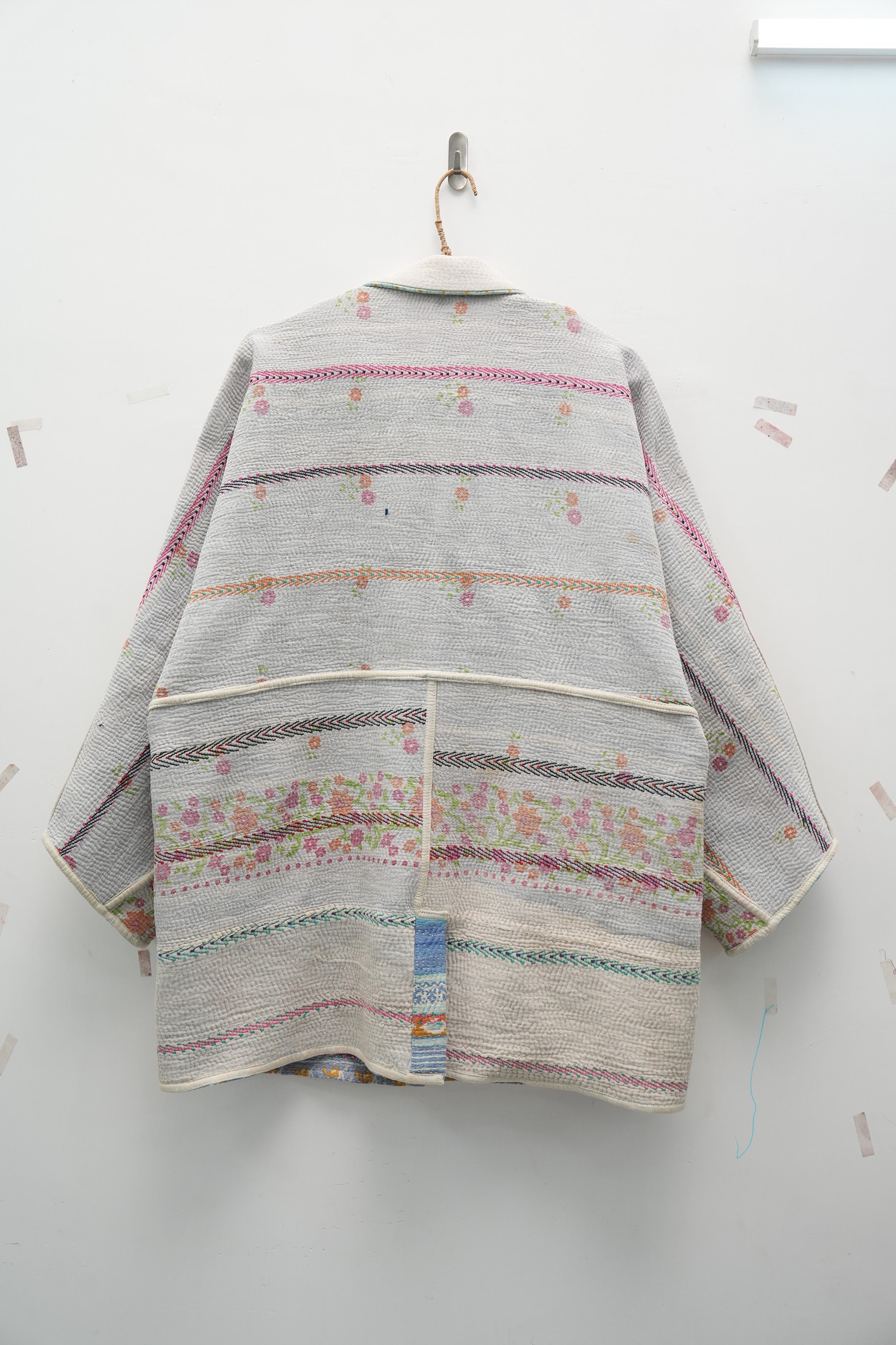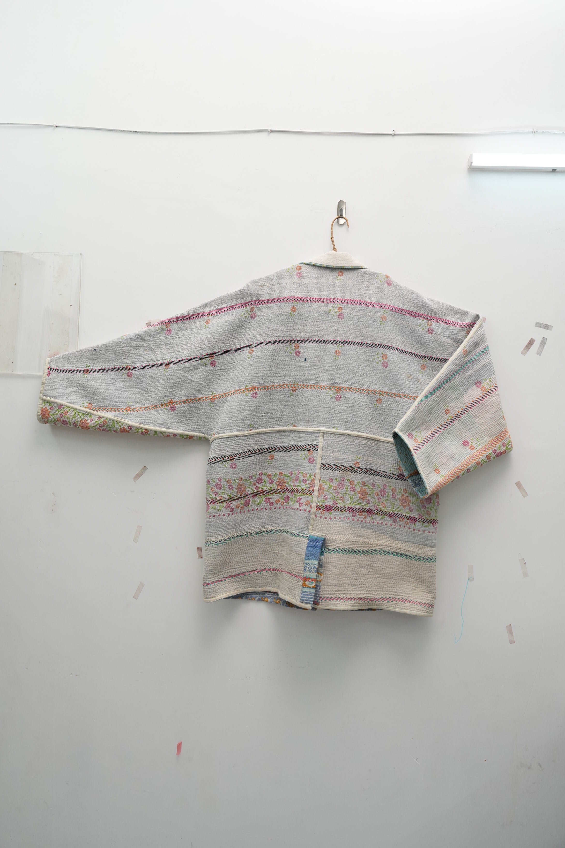An heirloom in motion — stitched from vintage kantha quilts, this jacket carries delicate floral bands and soft hues of ivory, pink, and mint. Lightweight yet cozy, it’s perfect for fall layering and quiet winter mornings.