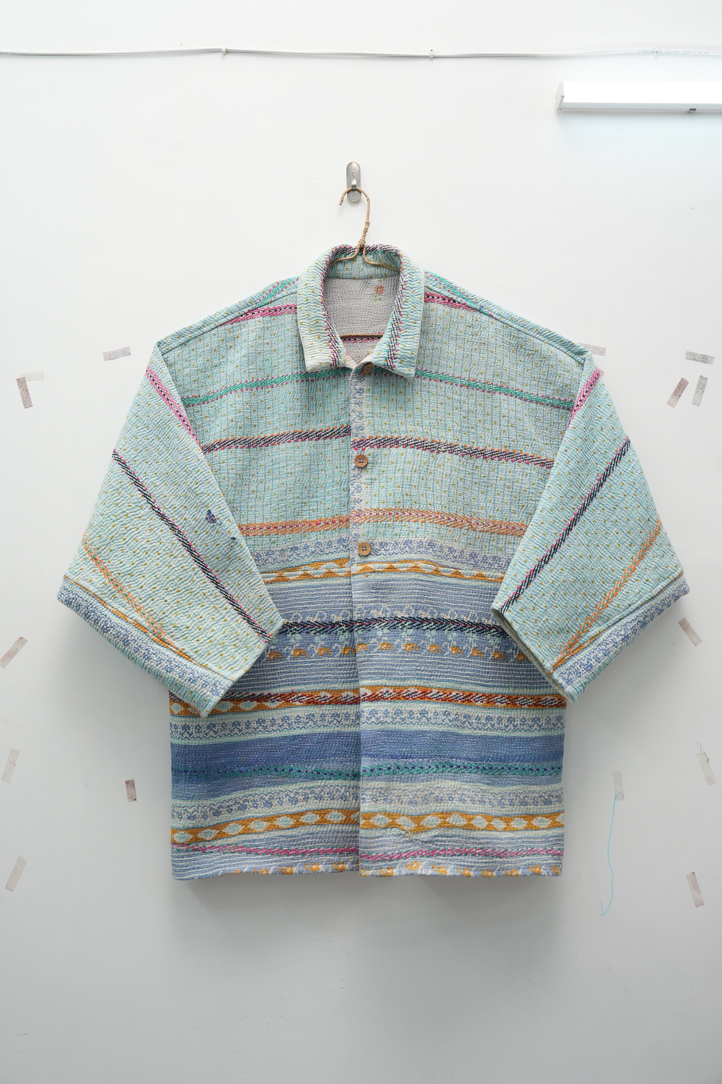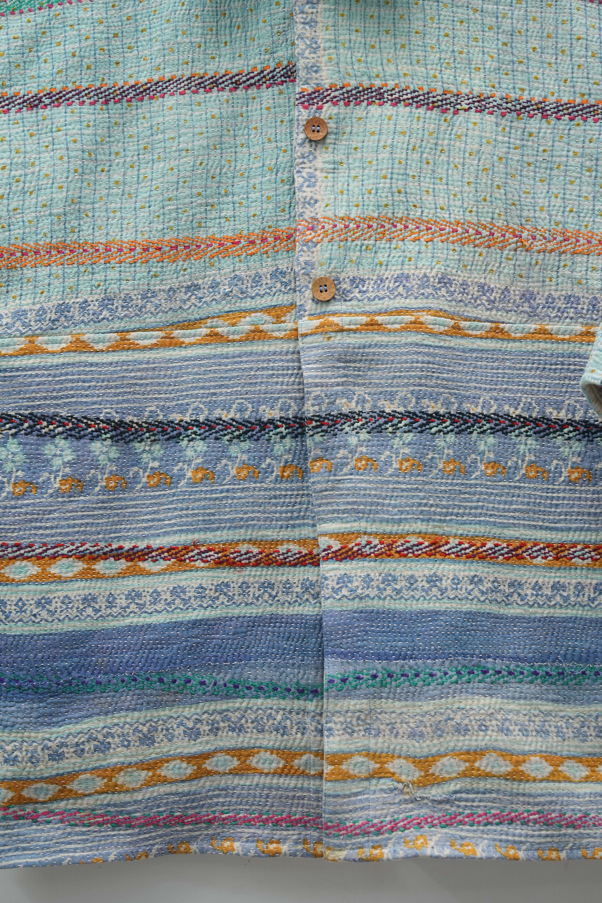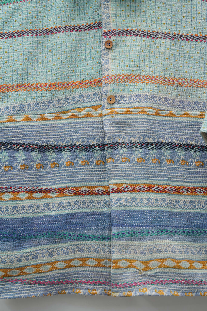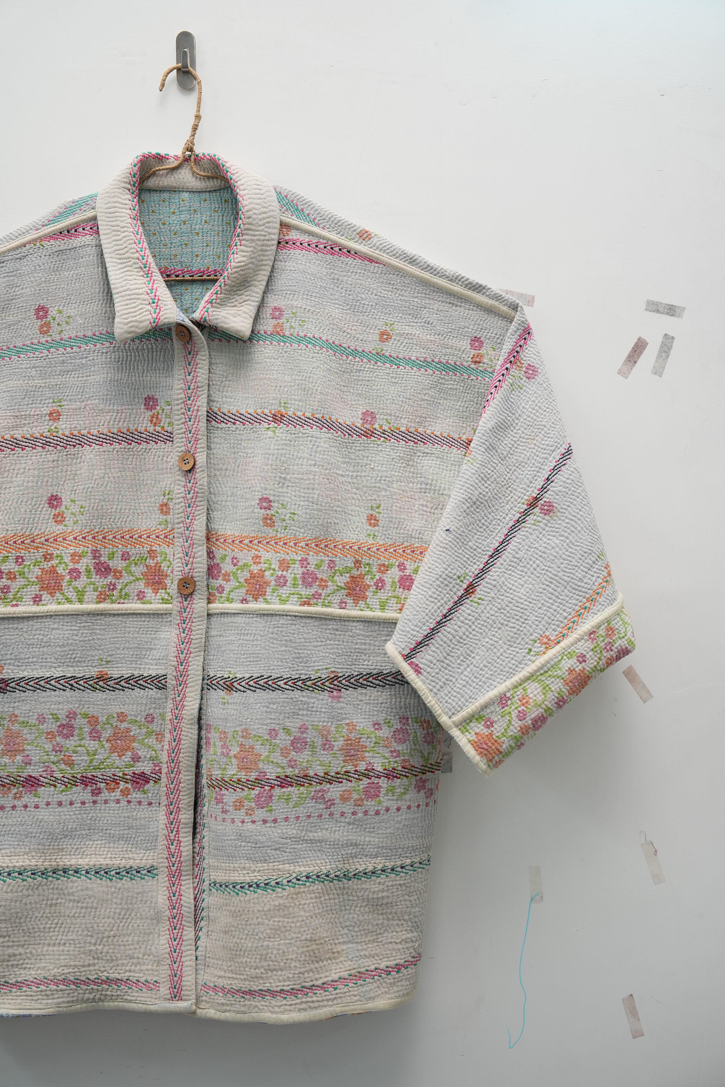 An heirloom in motion — stitched from vintage kantha quilts, this jacket carries delicate floral bands and soft hues of ivory, pink, and mint. Lightweight yet cozy, it’s perfect for fall layering and quiet winter mornings.